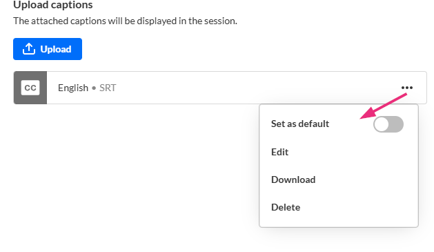 You can manage caption files for a session recording or any uploaded video source. This includes setting a default file, editing captions, downloading files, and deleting files.