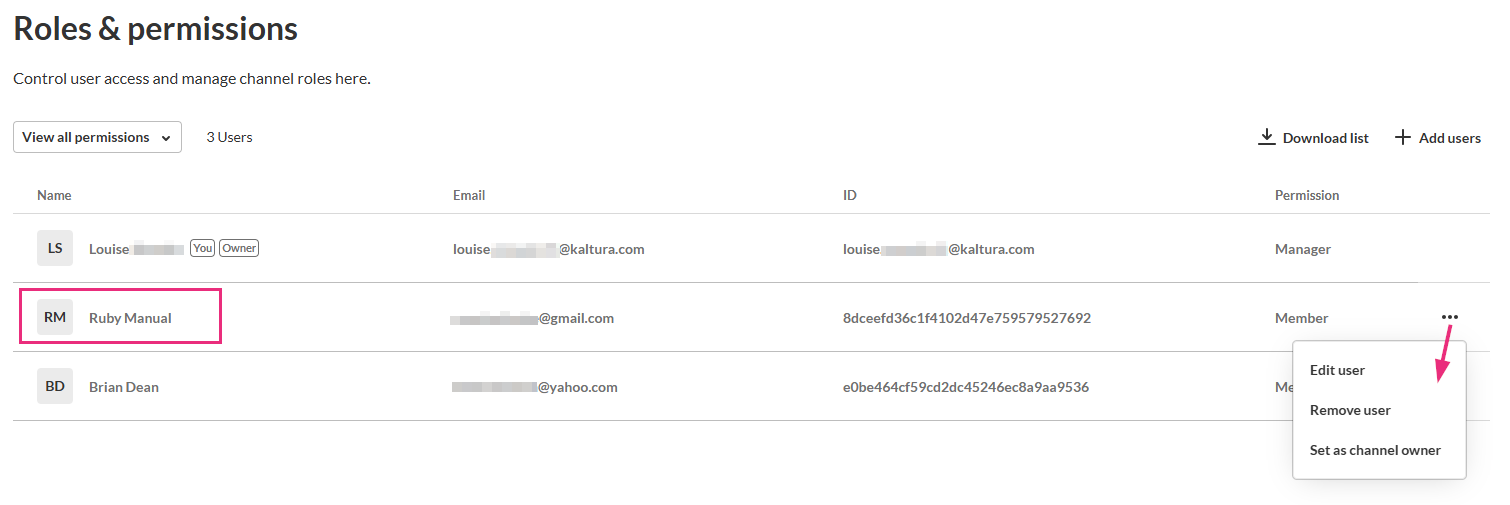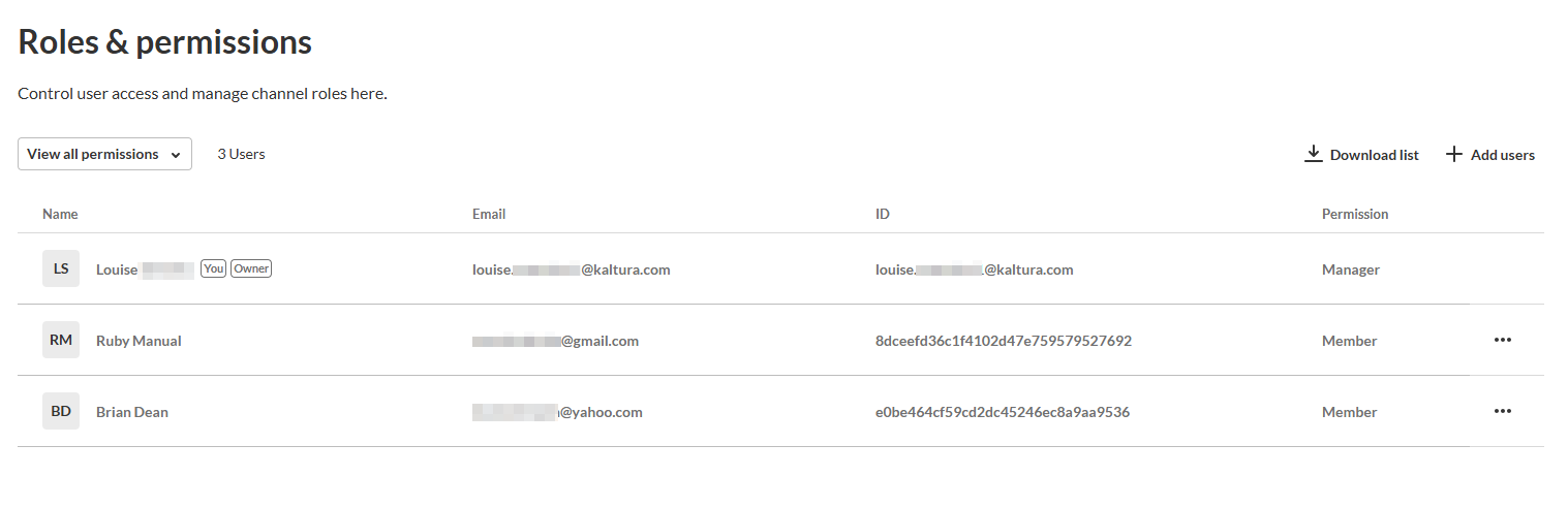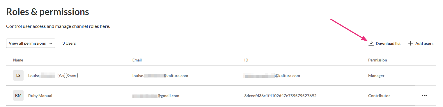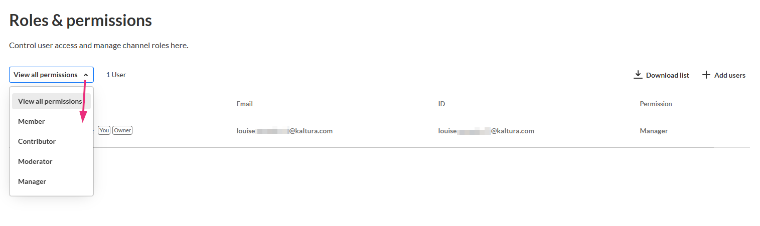 Use the View all permissions drop-down menu to filter the list by role. This helps you quickly find users with a specific permission, such as managers or contributors.