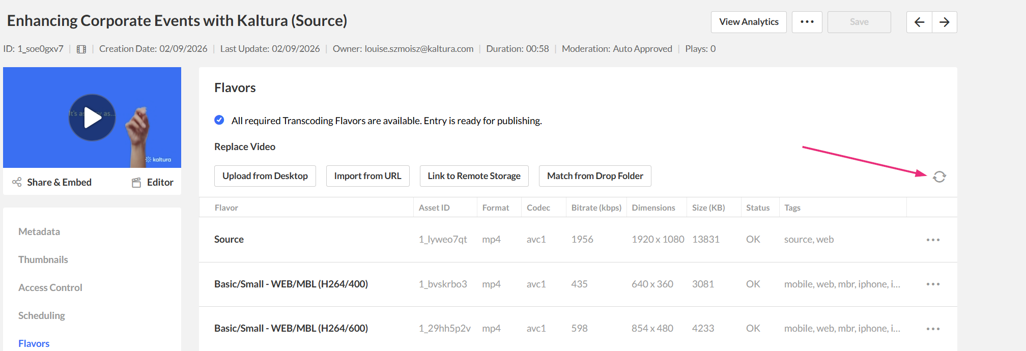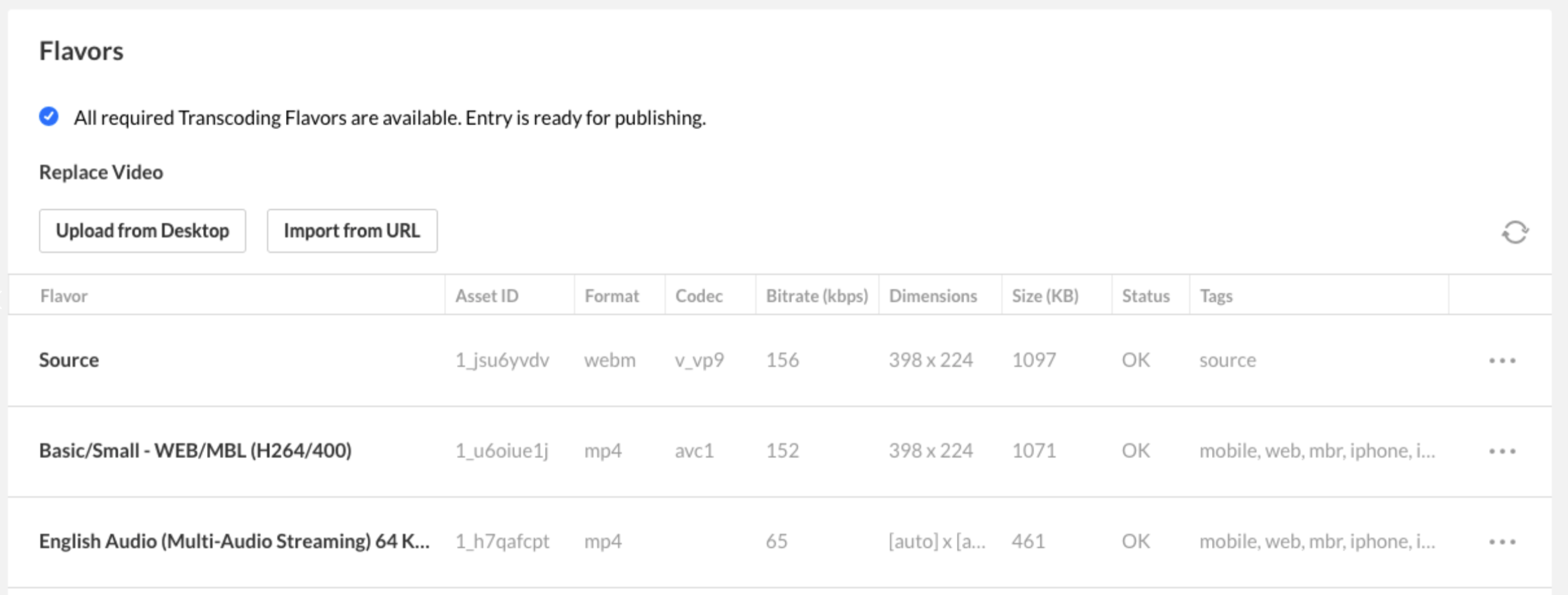 The Flavors tab lets you manage the different versions of your media. Each flavor is just a copy of the video or audio in a different quality or format. From here, you can download, upload, replace, or remove flavors, and you can also swap out the entry’s main source file if needed.