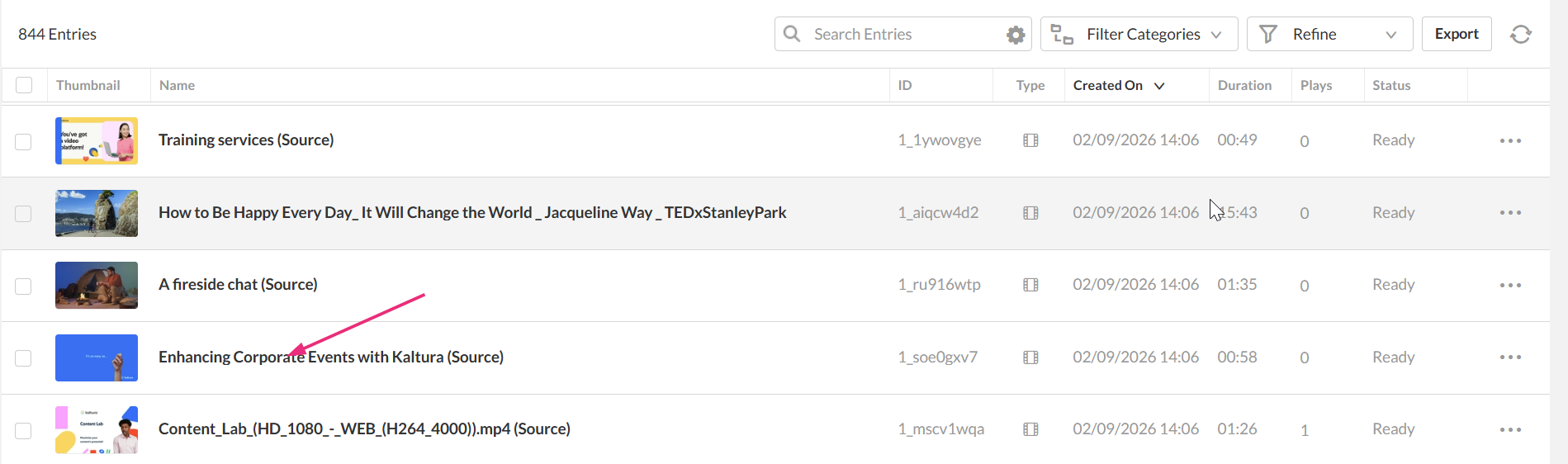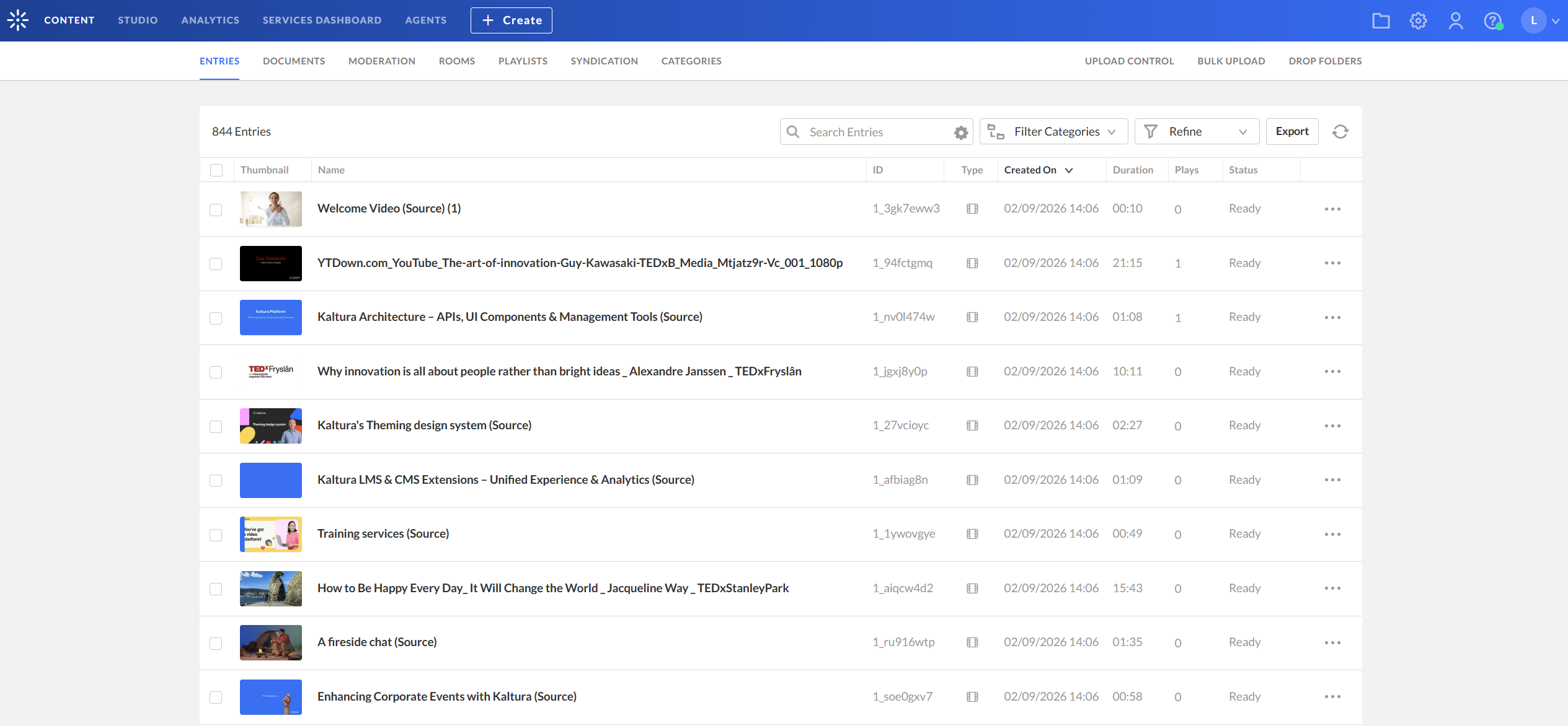 - Log into your Kaltura Management Console. The Entries page displays by default.