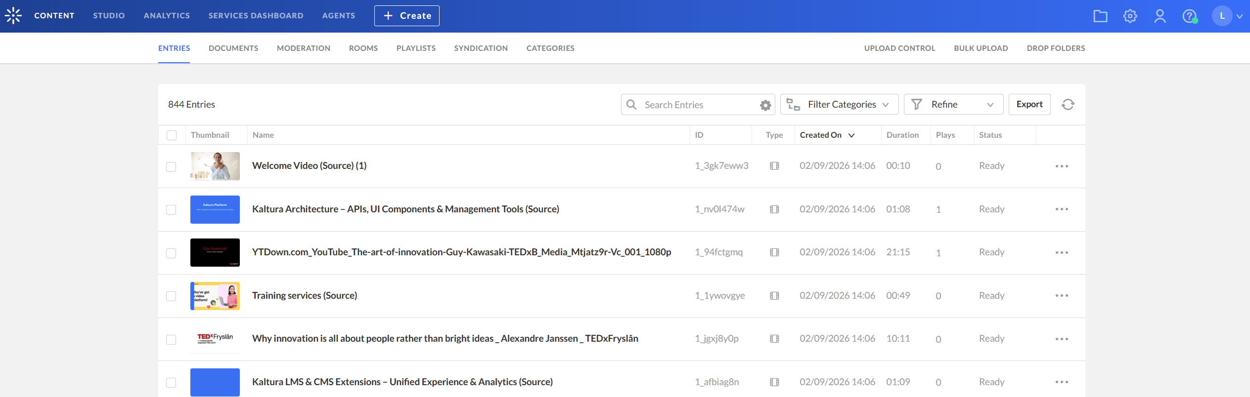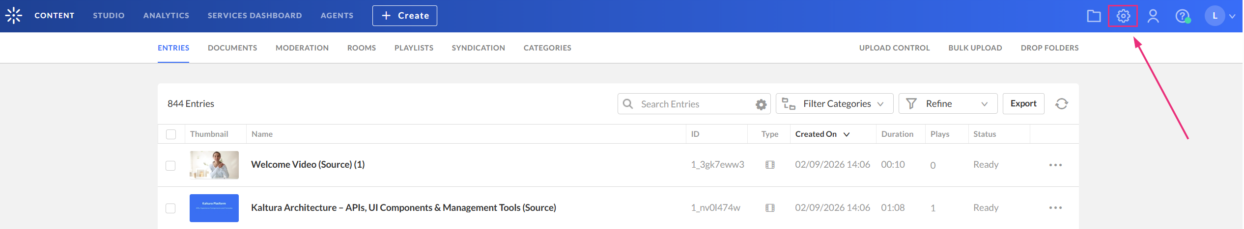 - Log into your KMC. The Entries page displays by default.