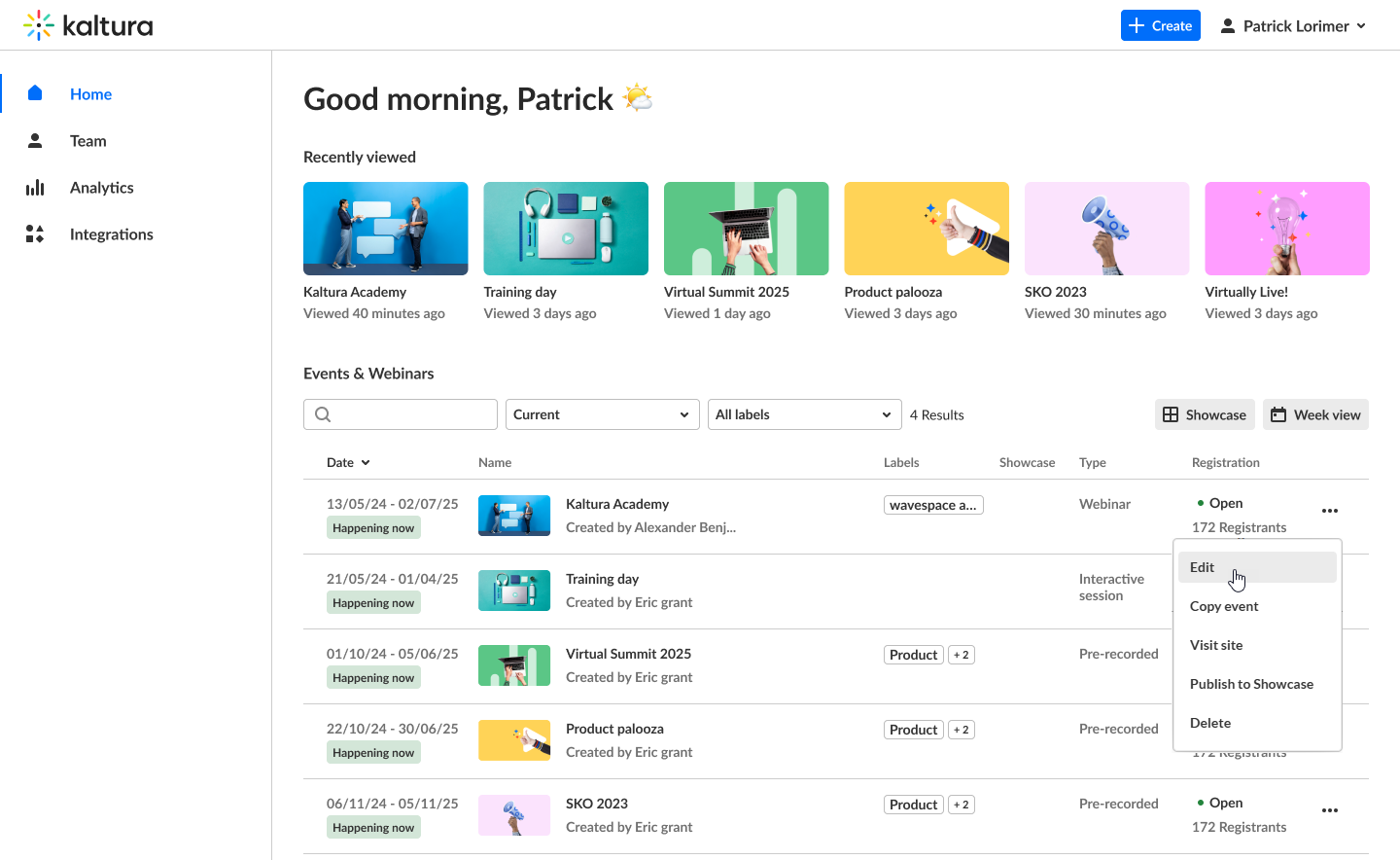 From the event list, Select Edit from the actions menu to edit the event to which you would like to add the integration.