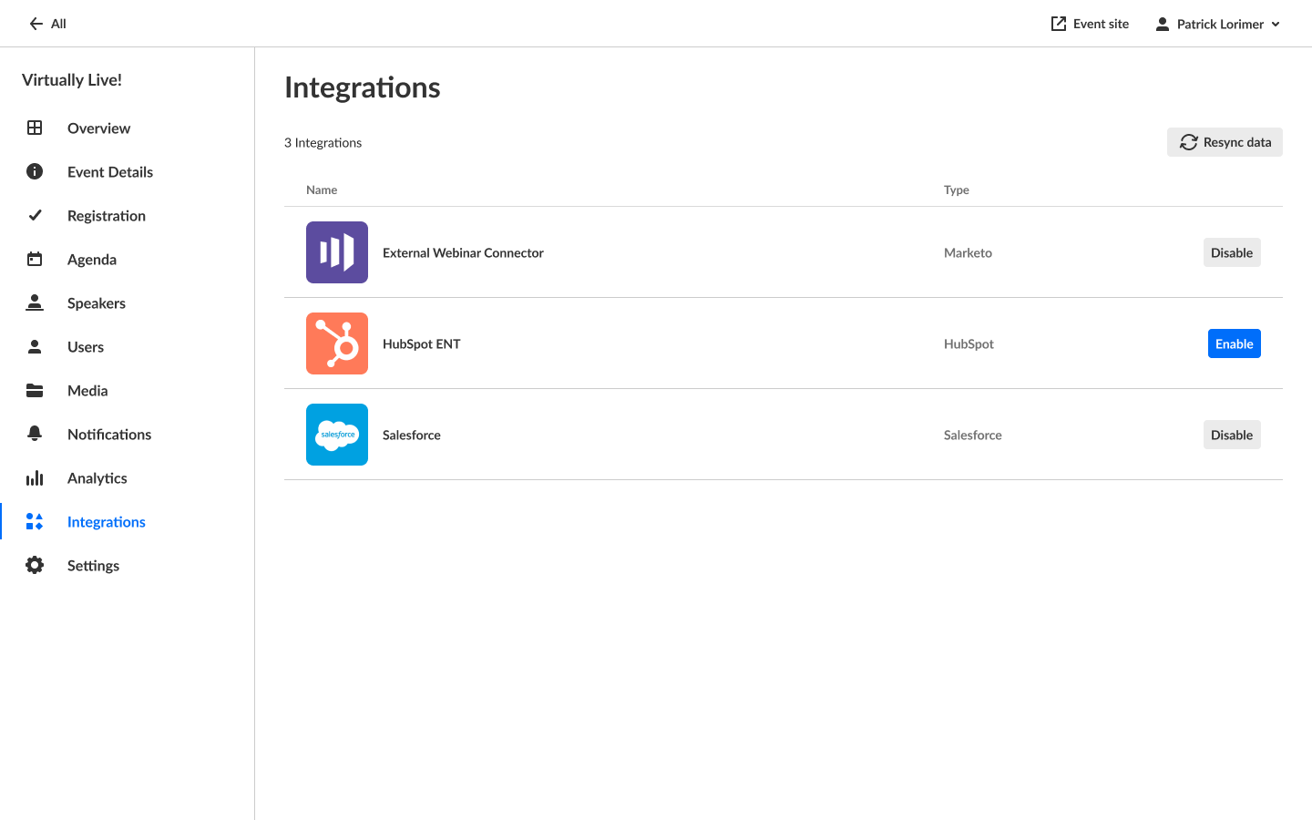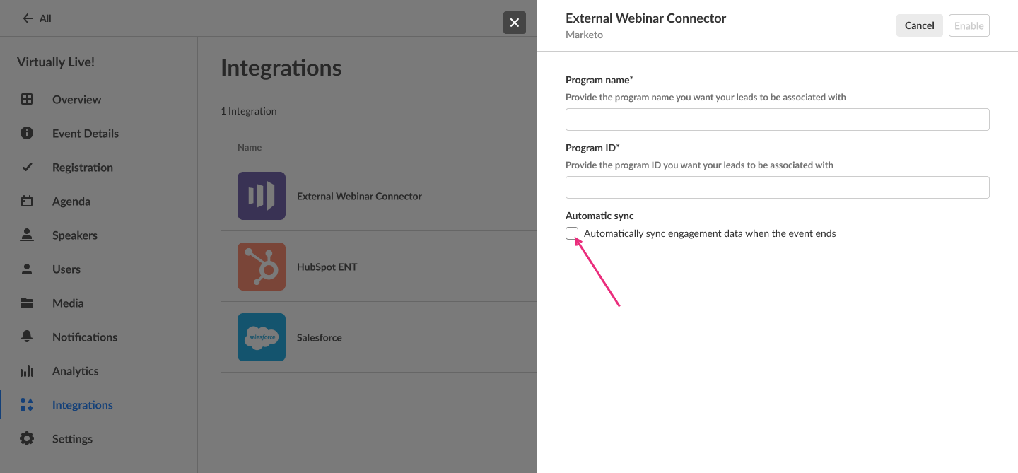 - Click Disable to disable an integration. Disabling an integration stops the data synchronization to Marketo for this event.
