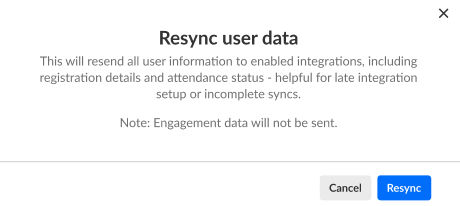 The Resync data button only refreshes registration and attendance information. Engagement data is not included in manual resyncs.