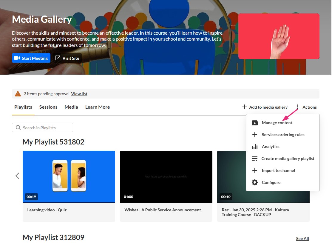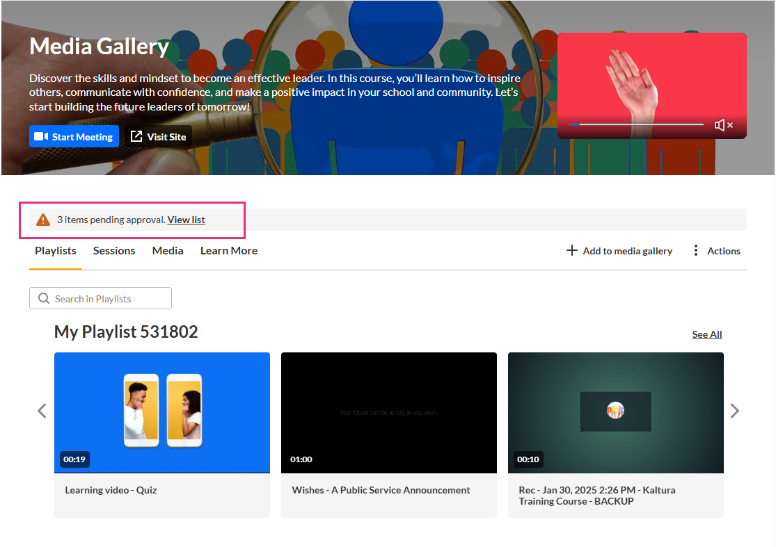 If there is pending media, a notification displays under the banner: [x] items pending approval. View list.