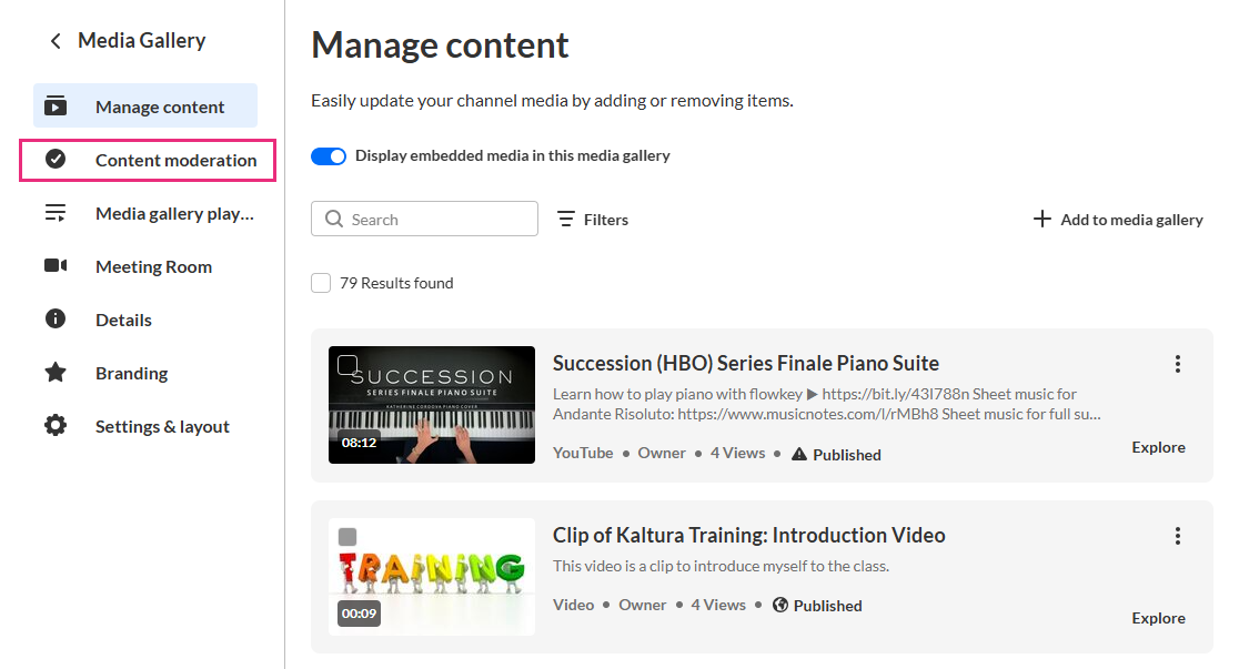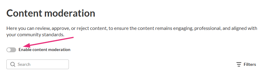 If content moderation hasn’t been enabled yet, use the toggle at the top of the page to enable it. Once enabled, new media submitted to the gallery will require approval before becoming visible.
