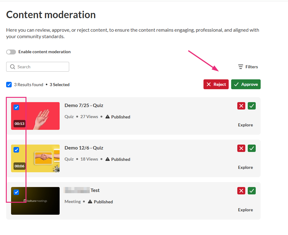 Kaltura's content moderation feature allows managers and moderators to approve or reject media before it becomes publicly accessible, ensuring that all content aligns with community standards.