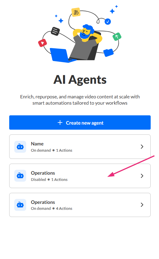 The AI Agents screen displays. The agents you've created are listed below the Create new agent button.