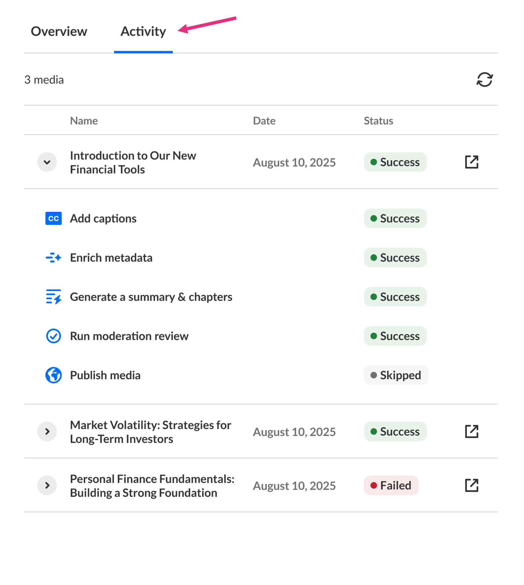 The Activity tab displays a list of runs and/or input items (entries, events, etc. depending on the agent) on which the agent ran. For each item, the following is displayed: