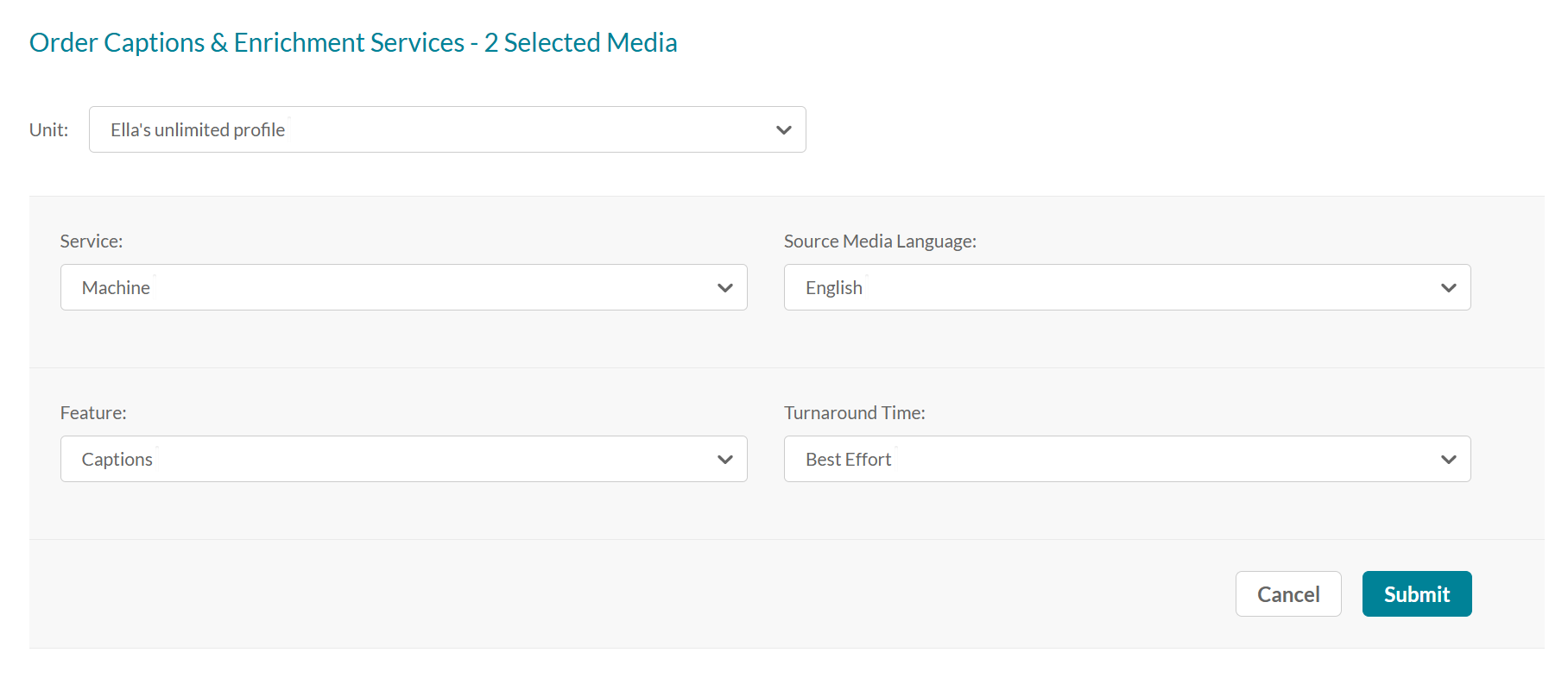 - Unit – This option only appears in the event that different Reach profiles (budgets) are configured for each unit in your account. The selected unit will be charged for the captions request.