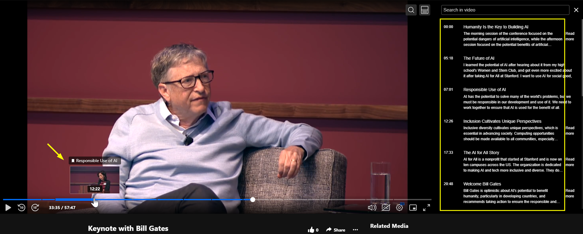 In addition, viewers can utilize the transcript's search functionality to pinpoint relevant keywords or phrases and instantly access the corresponding video chapter.