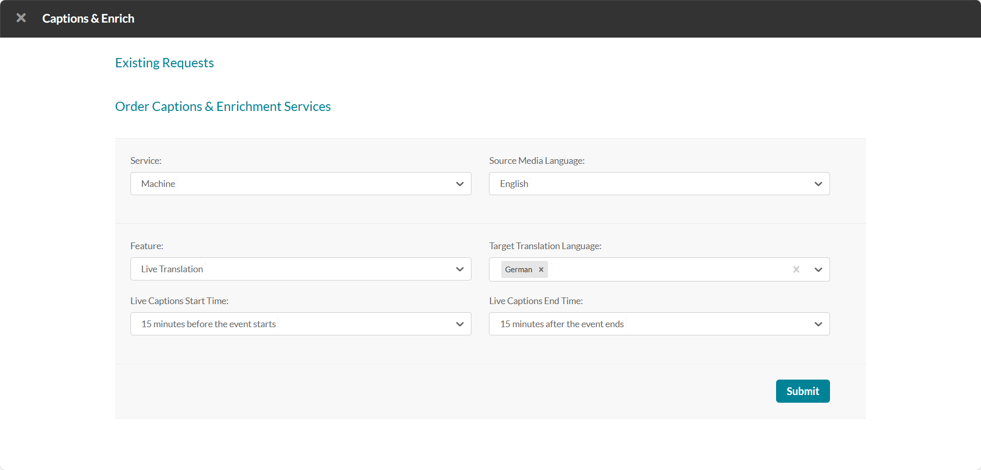 Kaltura provides machine-generated live captions and live translations through its Reach service. Once enabled on your account, these services can be ordered for any scheduled event via your Video Portal, Events platform or KMC.