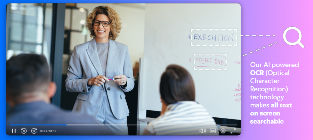OCR (Optical Character Recognition) makes it easy to search for text within a video, like titles, slide content, labels on graphs, or other on-screen text. This helps students and employees quickly find what they’re looking for, improving productivity and saving time.