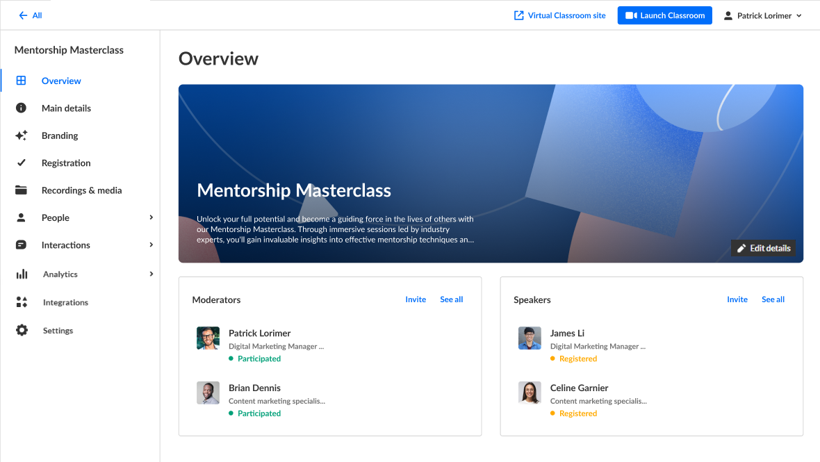 Click Edit details on the banner to edit virtual classroom details. See Main details tab - Edit the site details for more information.