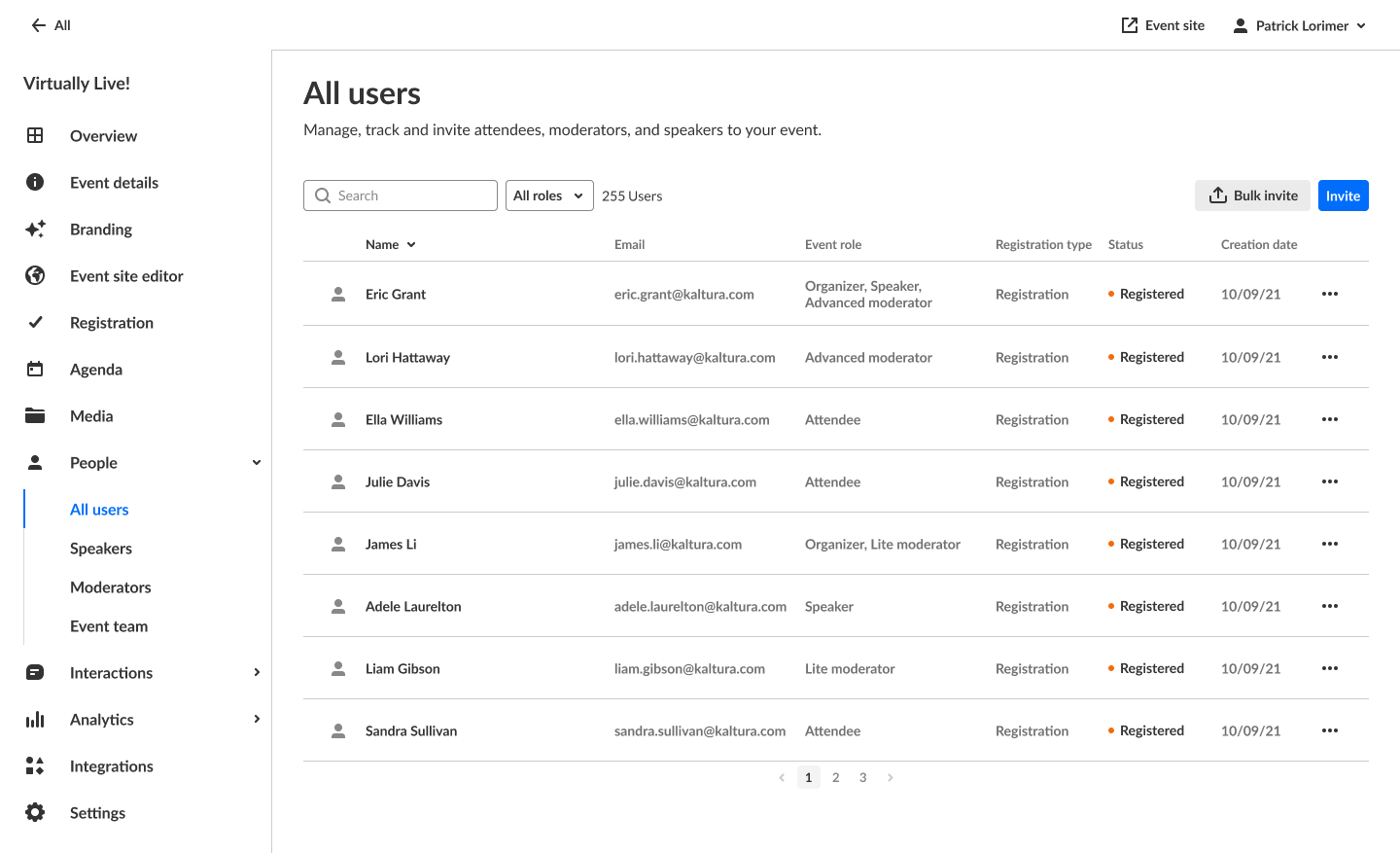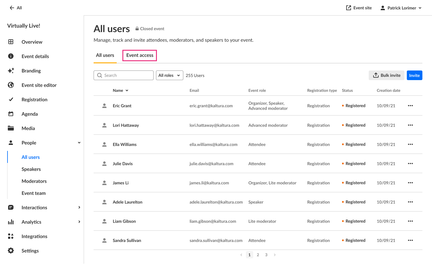 Once you have sent your invitations, you can use the All users page to view the full list of attendees for your upcoming event (including name, email, role, status, and creation date) and monitor their progress through the registration process.
