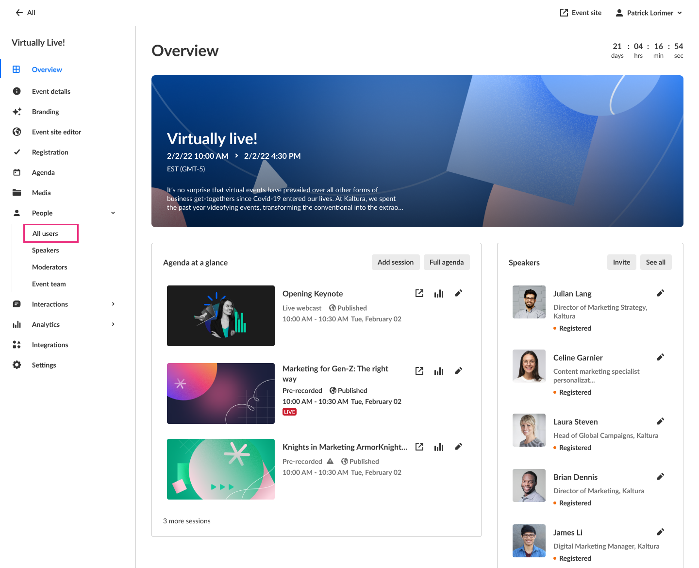 The Speakers page allows you to view a full list of speakers for your upcoming event (including name, bio, and status) and monitor their progress through the registration process. You may also invite new speakers directly from the Speakers page. See Kaltura Events - Invite Speakers to Your Event.