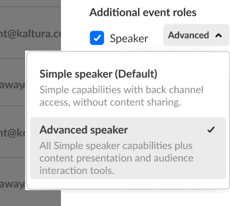 - If you designate them as a Speaker, select their Speaker permissions - either Simple speaker (default) or Advanced speaker.