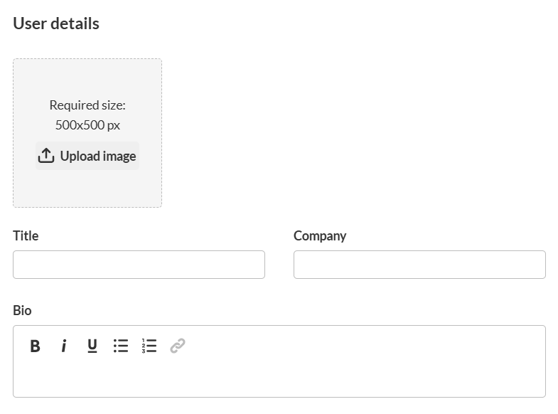 - Bio (optional field) - Short description for the user's profile page on the event site. Character limit: 2500