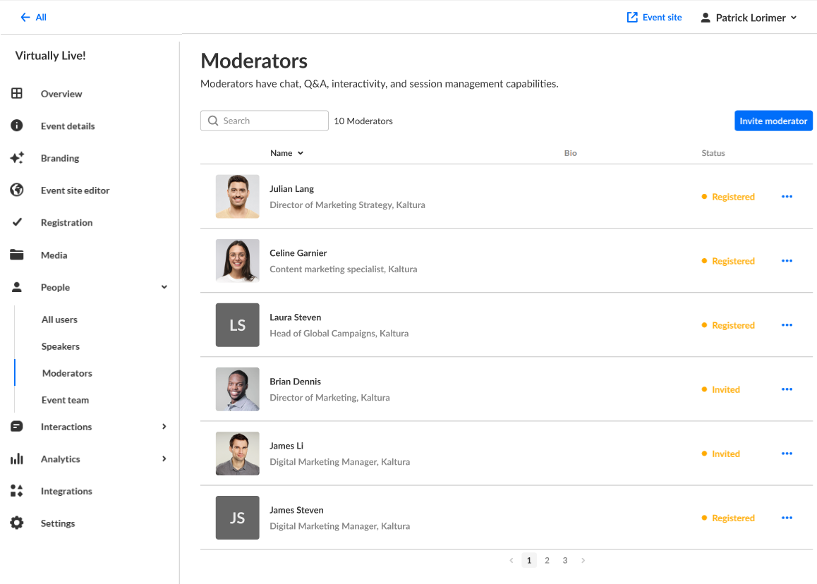 Once you have sent your invitations, you can use the Moderators page to view the full list of moderators for your upcoming event (including name, bio, and status) and monitor their progress through the registration process.