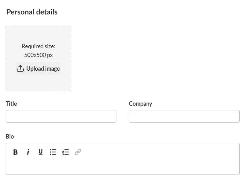 - Bio (optional field) - Short description for the user's profile page on the event site. Character limit: 2500