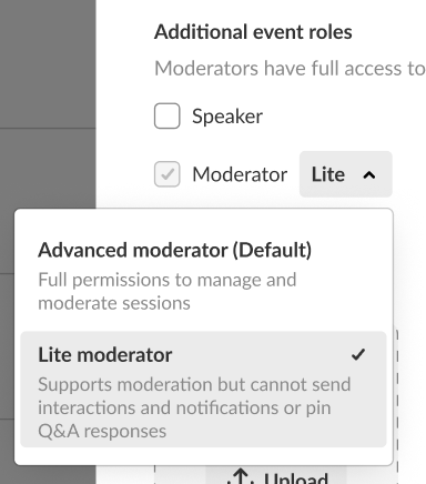 - Choose whether (in addition to having a Moderator role) they will have the additional role of Speaker.
