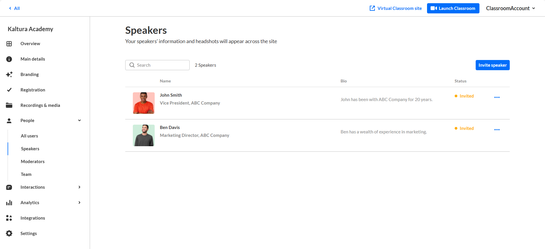 Once you have sent your invitations, you can use the Speakers page to view the full list of speakers for your upcoming webinar (including name, bio, and status) and monitor their progress through the registration process.