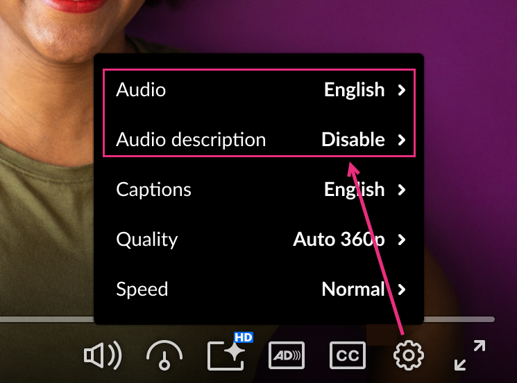 - Depending on your configuration, Audio and Audio Description options may be available either in the player controls bar and/or in the settings (gear) menu. If your administrator has hidden the Audio button and/or Audio Description button from the player control bar, these options will still be available through the settings (gear) menu.