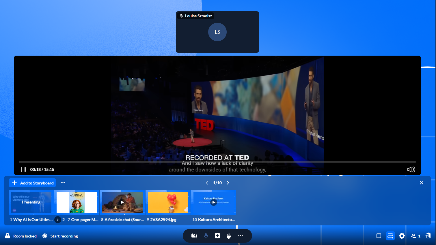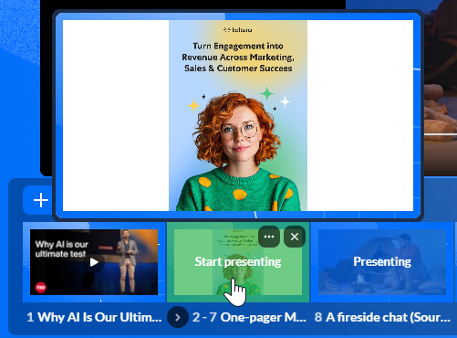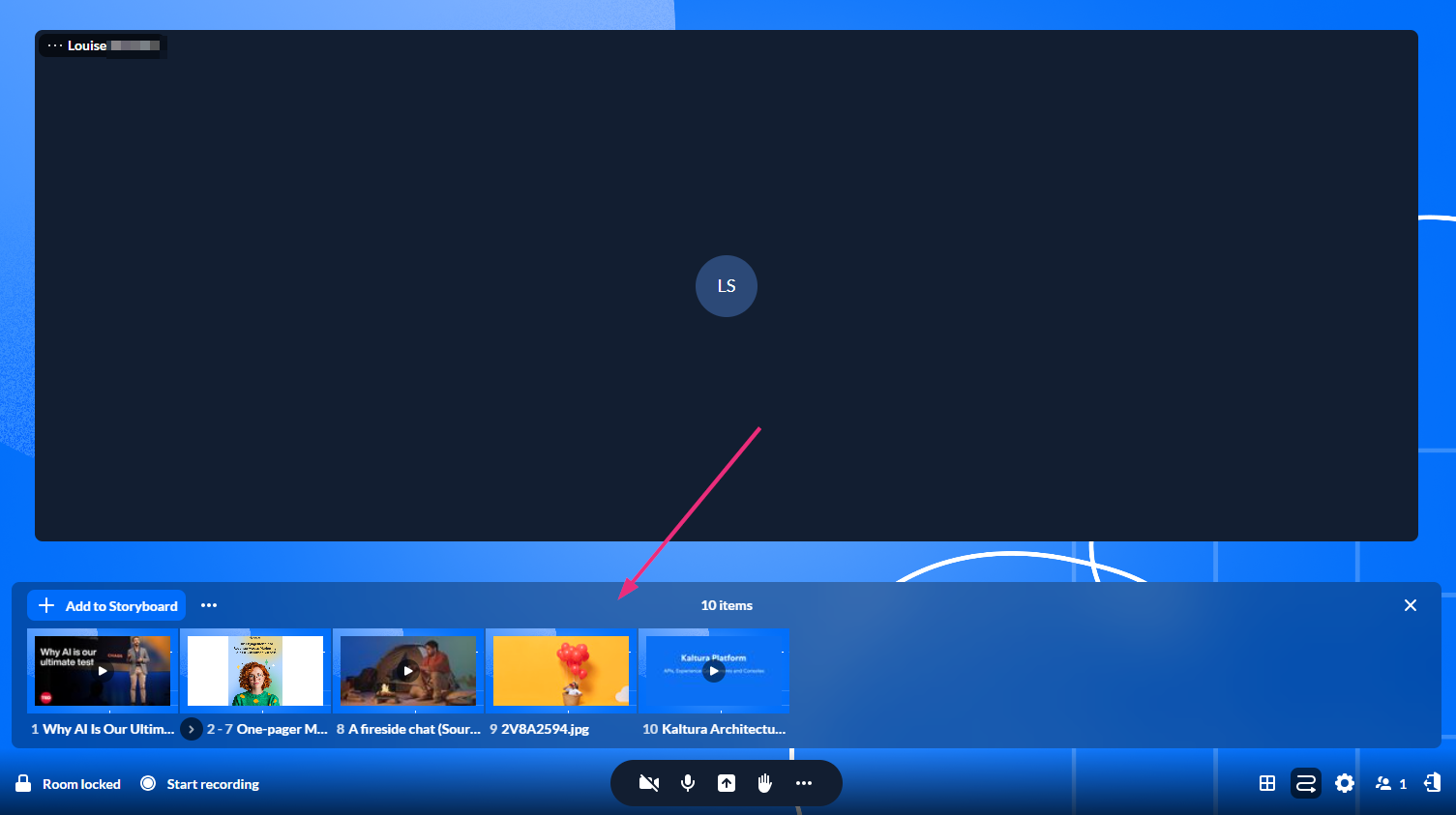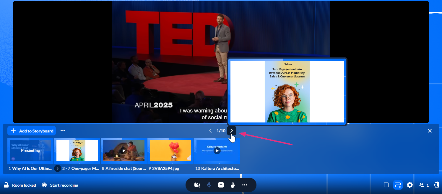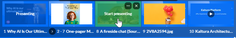 Moderators can present media in a Kaltura Room using the storyboard. Media added to the storyboard can be presented, reordered, edited, or removed at any time, making it easy to manage content during a session.