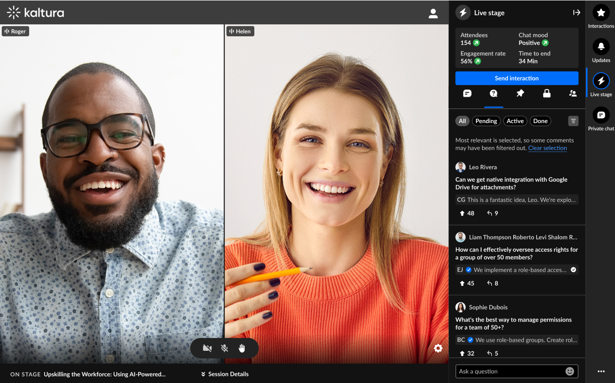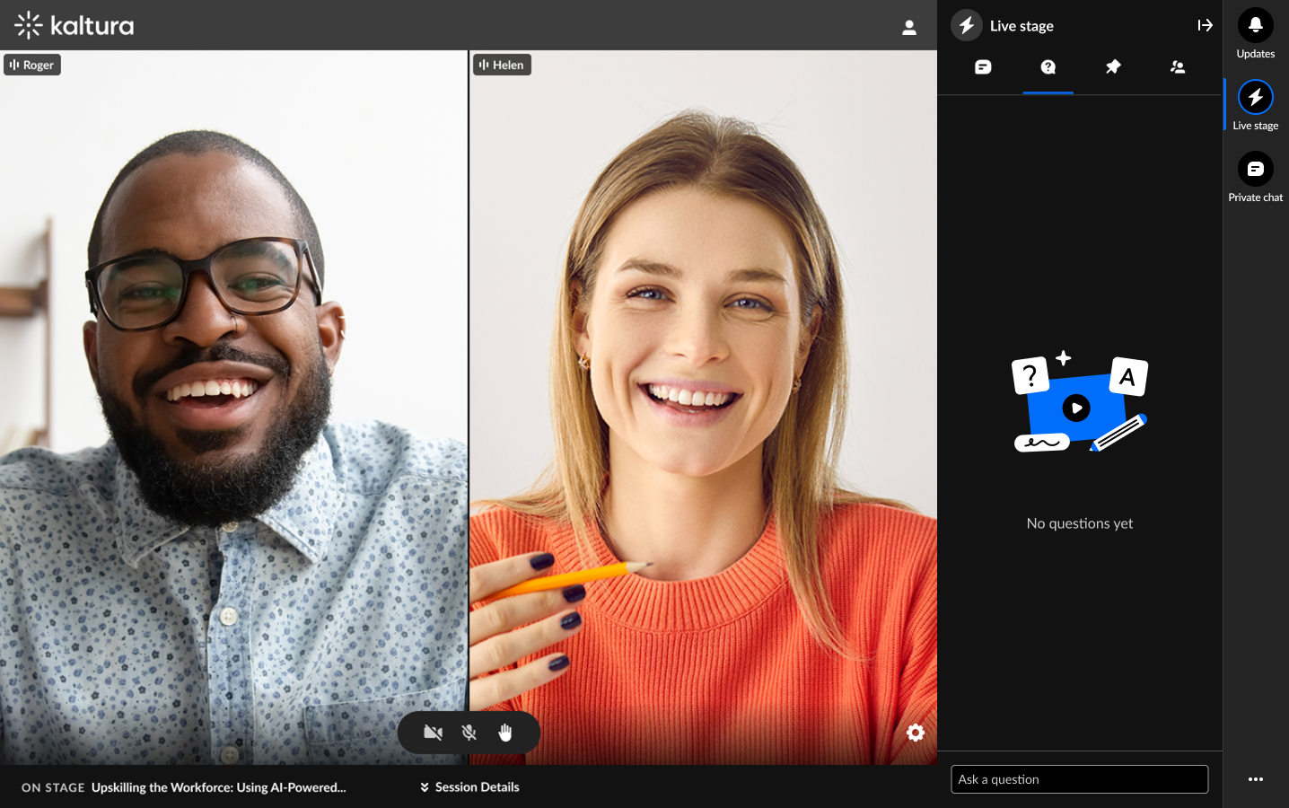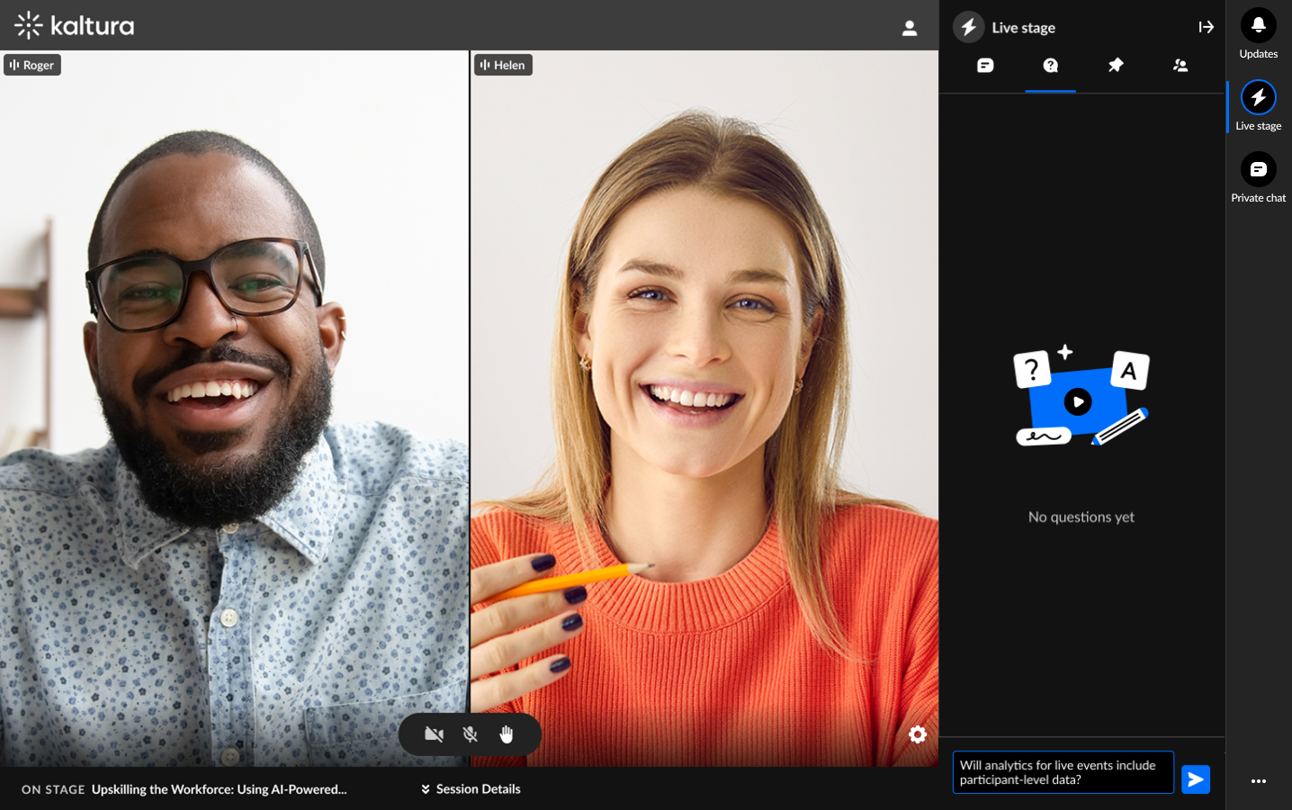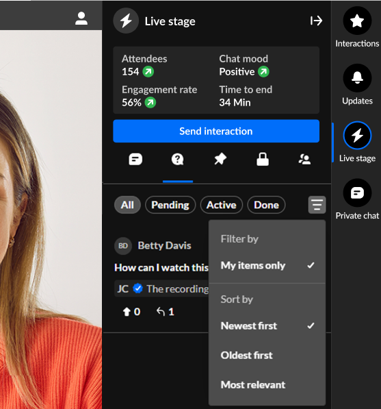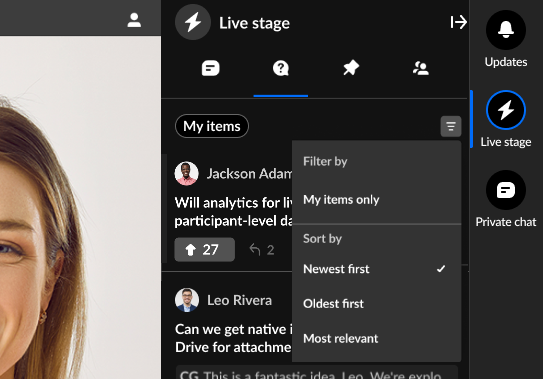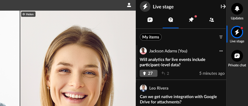 Please note - The chat and collaboration features in the Live Stage tab vary depending on whether your account administrator has enabled a Public Q&A experience. This article details the Live stage experience with Public Q&A enabled. For the non-Public Q&A experience, see here.
