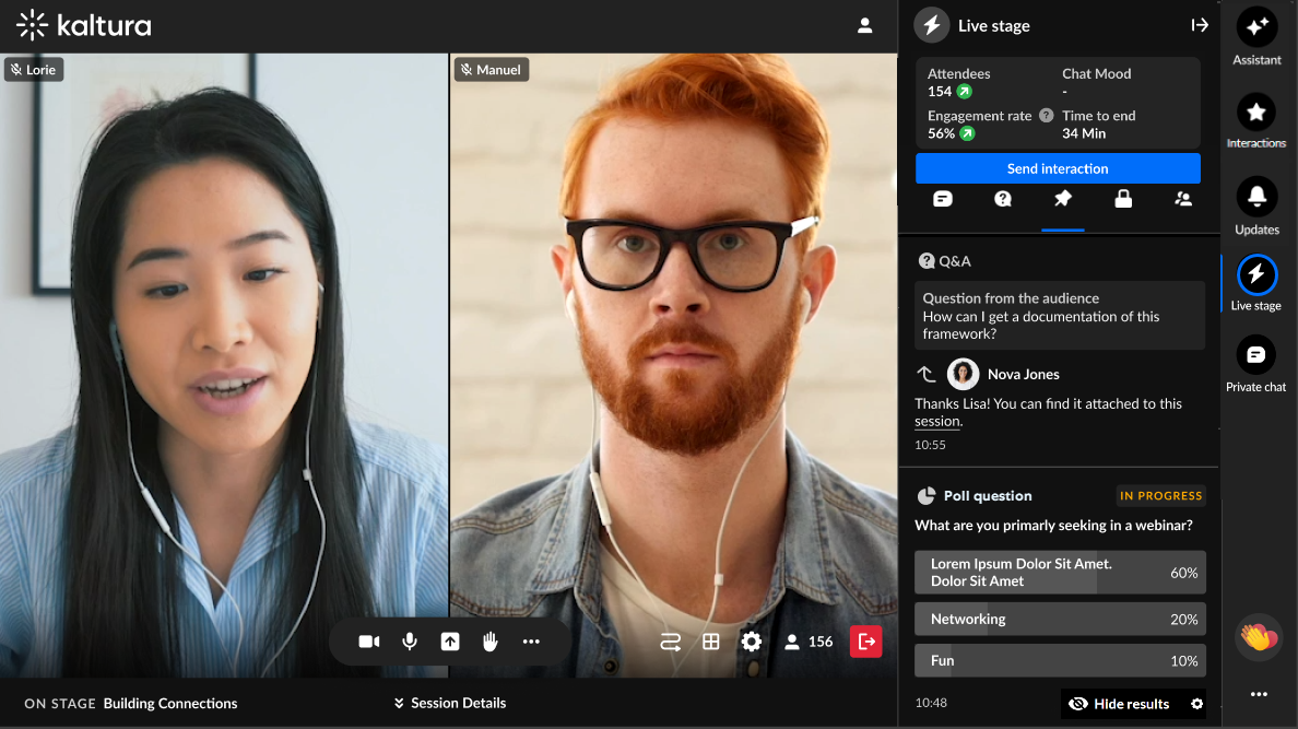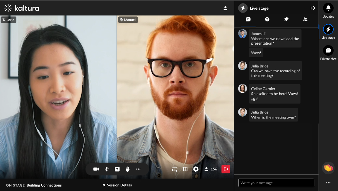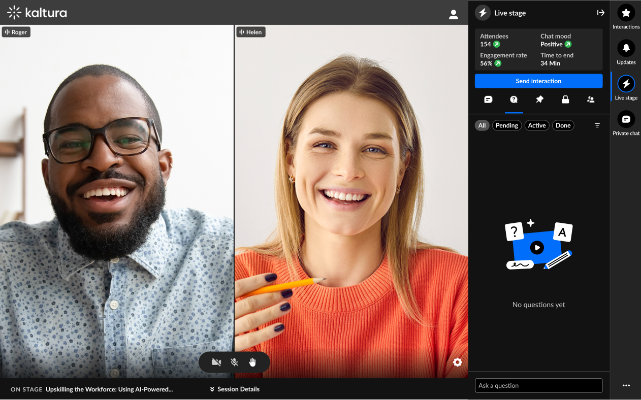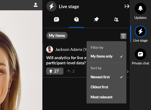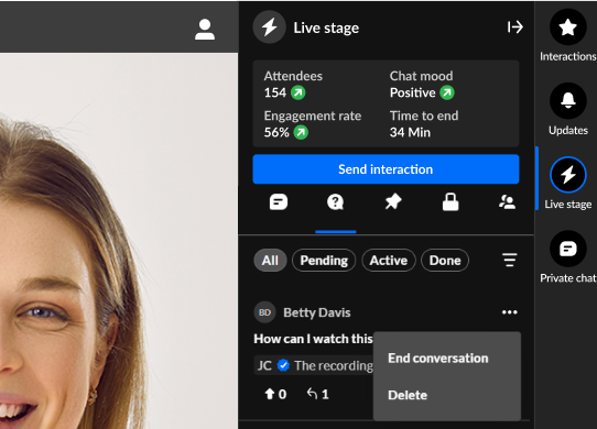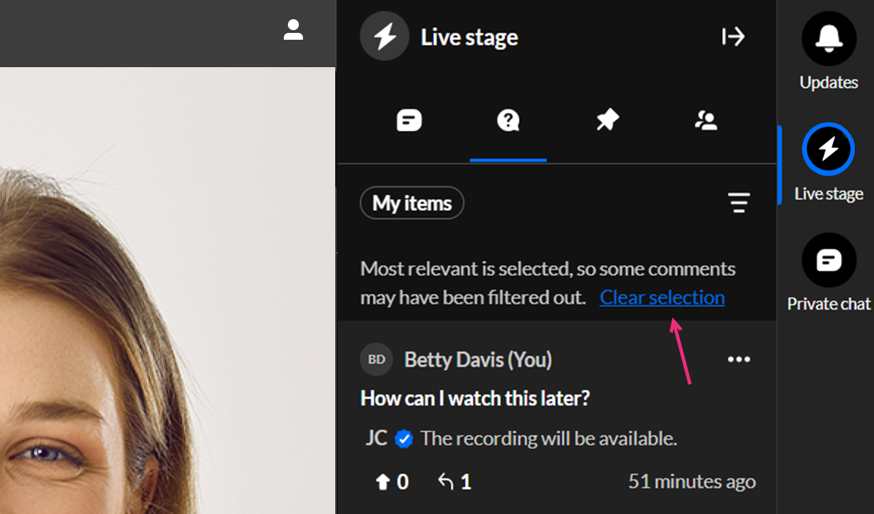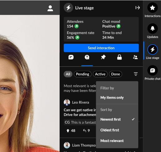 Please note - The chat and collaboration features in the Live Stage tab vary depending on whether your account administrator has enabled a Public Q&A experience. This article details the Live stage experience with Public Q&A enabled. For the non-Public Q&A experience, see here.
