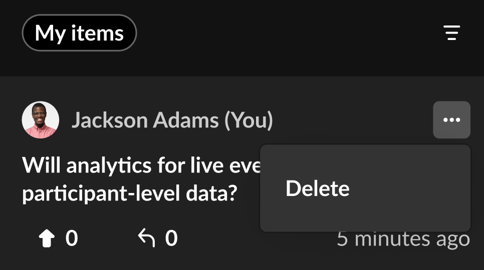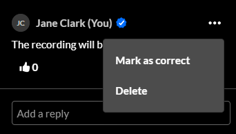 - Click to select a reply, then click the three-dot menu on the reply and select "Delete" (archive) the item. (As an attendee, you can only delete replies made by you.)