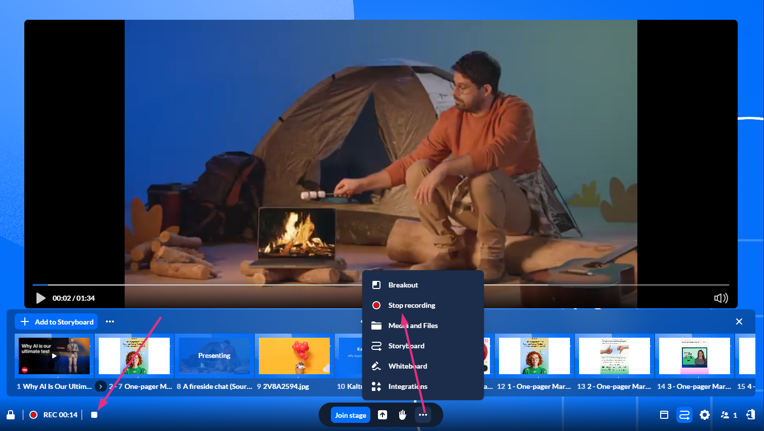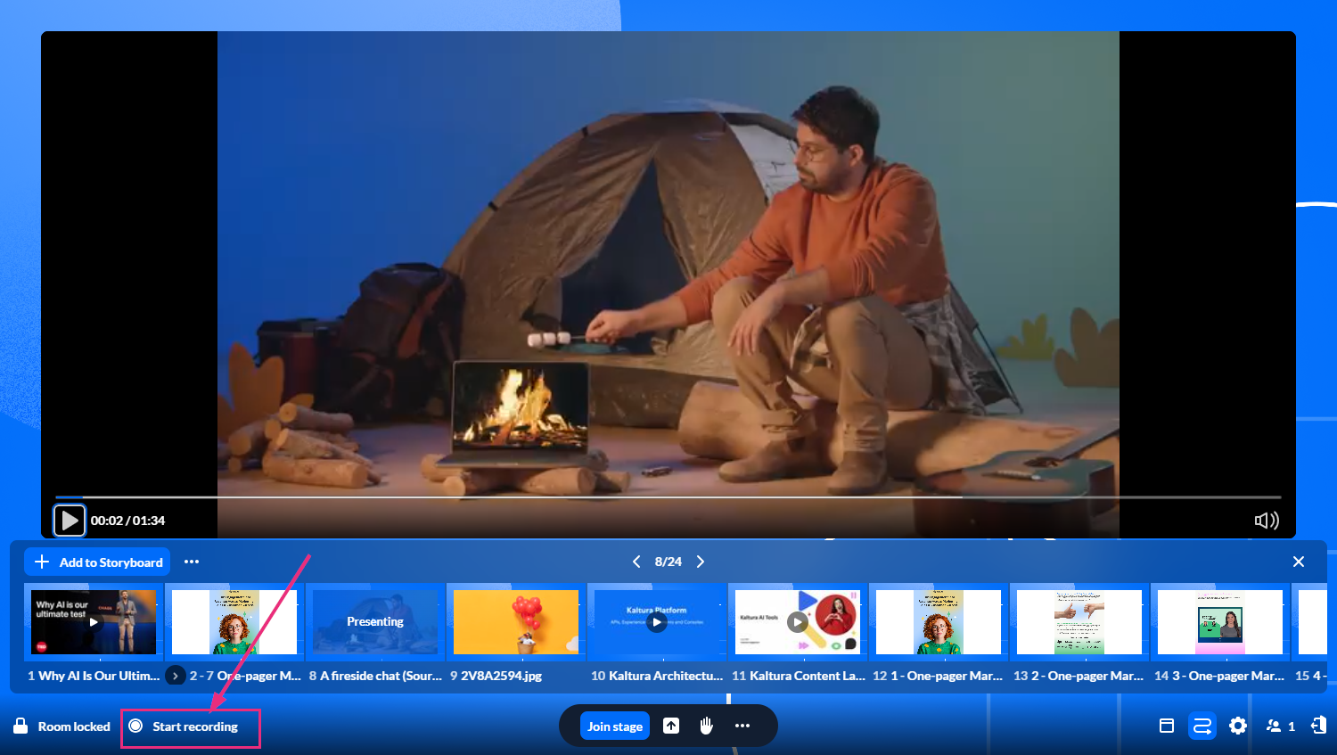 Moderators and hosts can record a Kaltura Room session. The recording captures the content shown on the stage, including shared content and participants on camera.