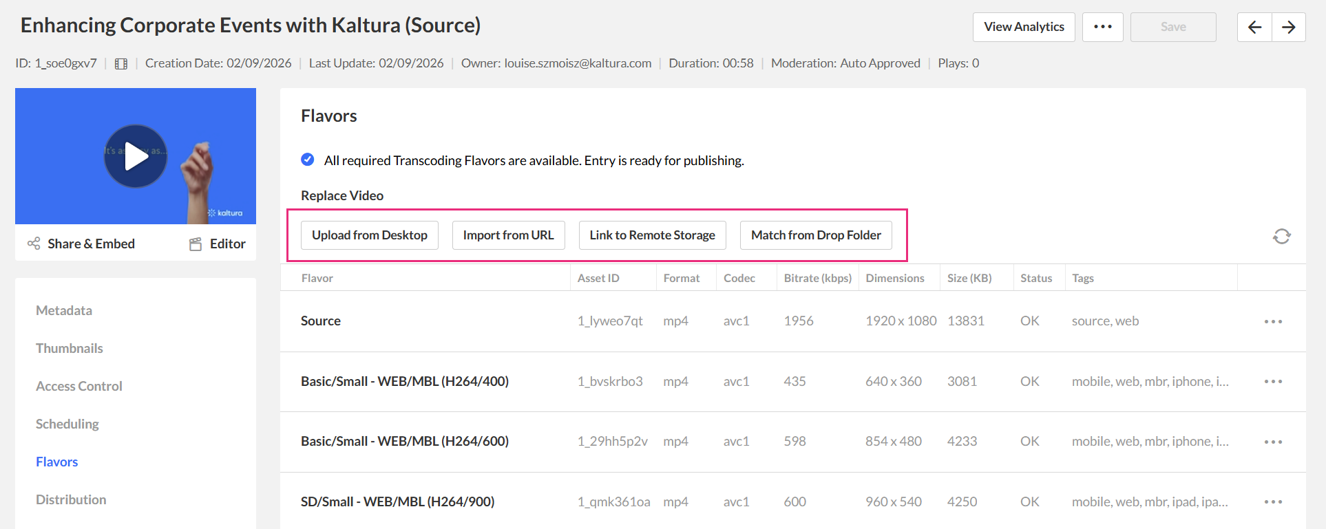 Once the replacement process has finished, an alert displays: All required Transcoding flavors are available. Entry is ready for publishing.