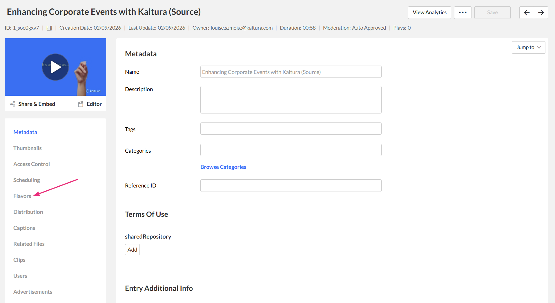 You can replace a media file in KMC without changing the media ID, metadata, links, embeds, or analytics. When you replace a media item, the original source file is swapped out and all transcoding flavors are regenerated together, helping resolve issues such as stuck or incomplete flavors.