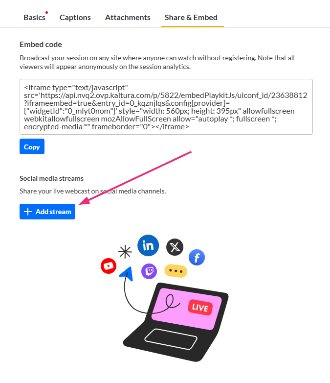 - Open the Share & embed tab in your Event controls and click + Add stream.