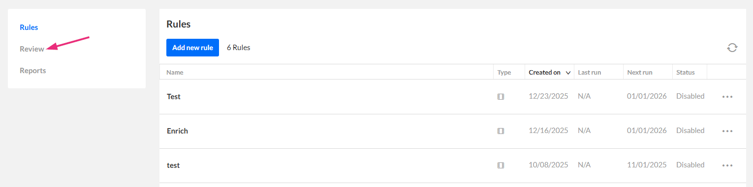 Media selected by a rule appears on the Review page for a limited review period. If no action is taken during that time, the media won’t appear again in future runs of the same rule. To review it again, create a new rule with the same settings.