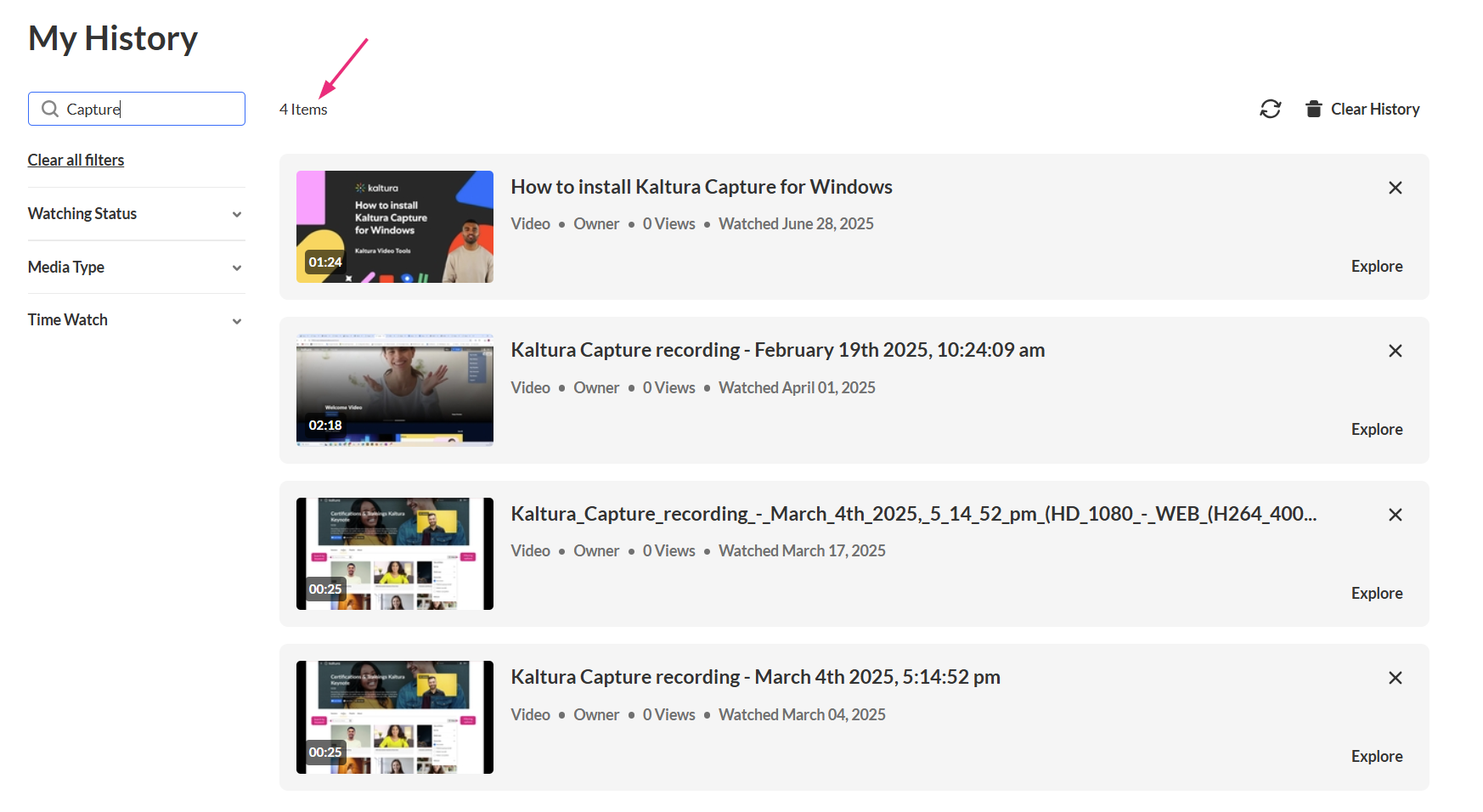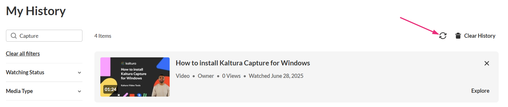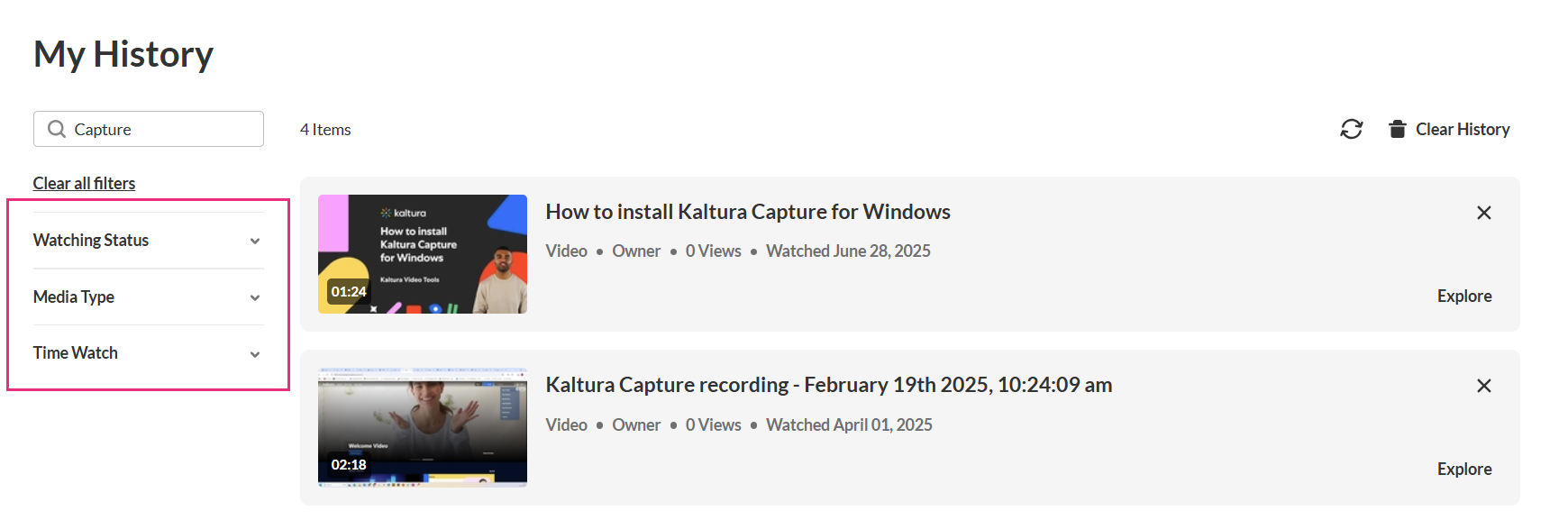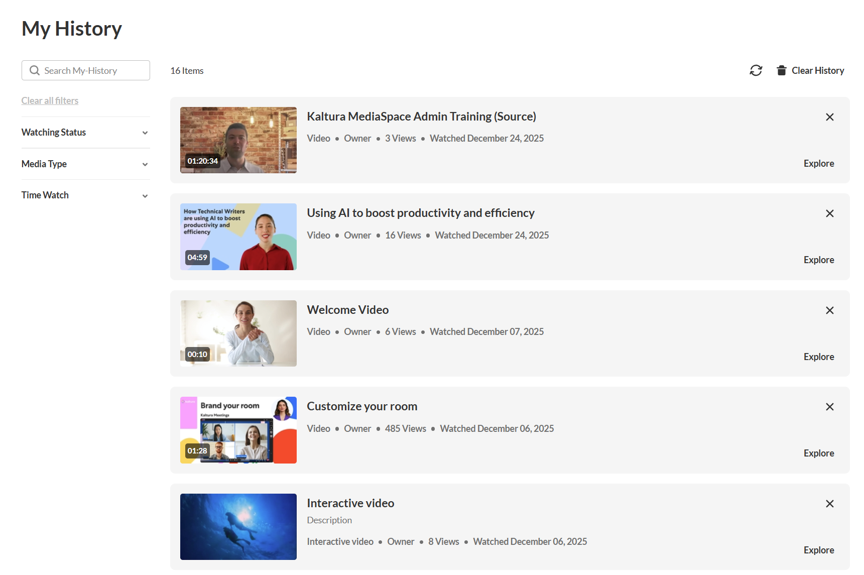 The My History page lets you quickly find media you’ve watched in your video portal. You can search by keyword and use filters to narrow results by media type, viewing status, or time range.
