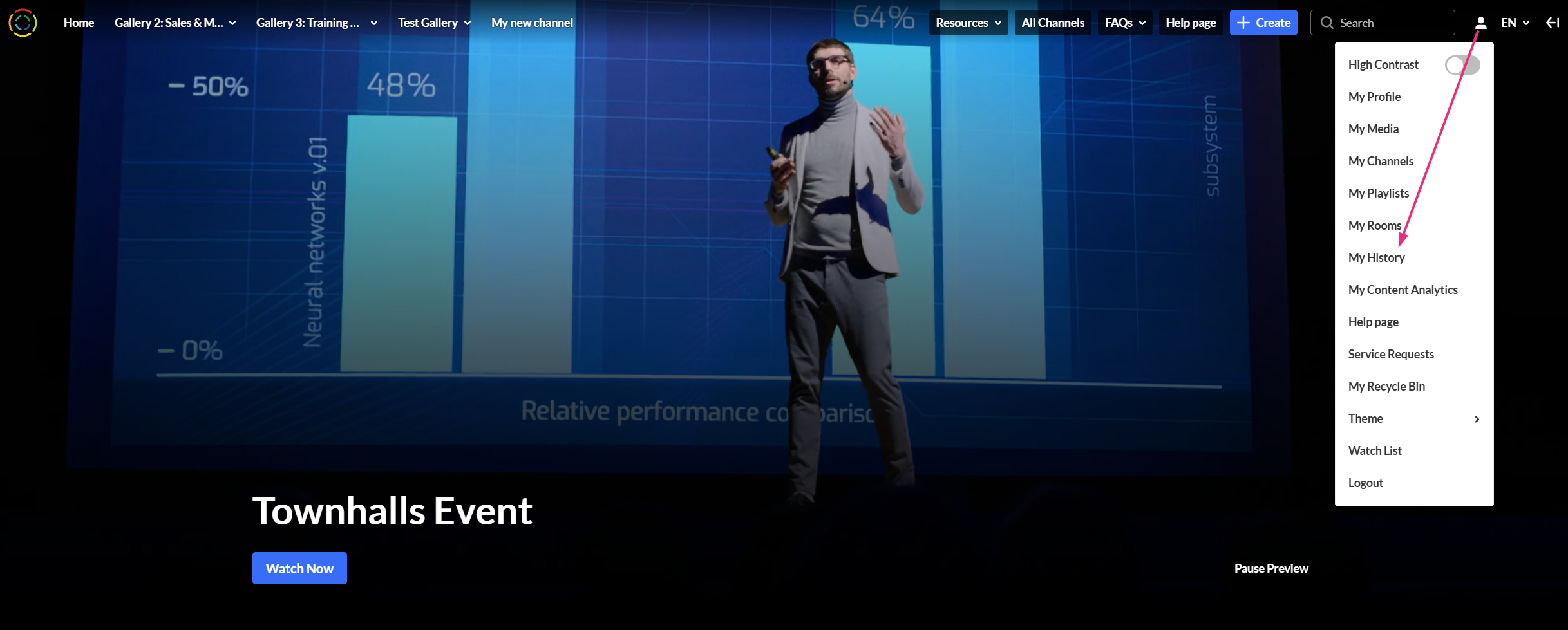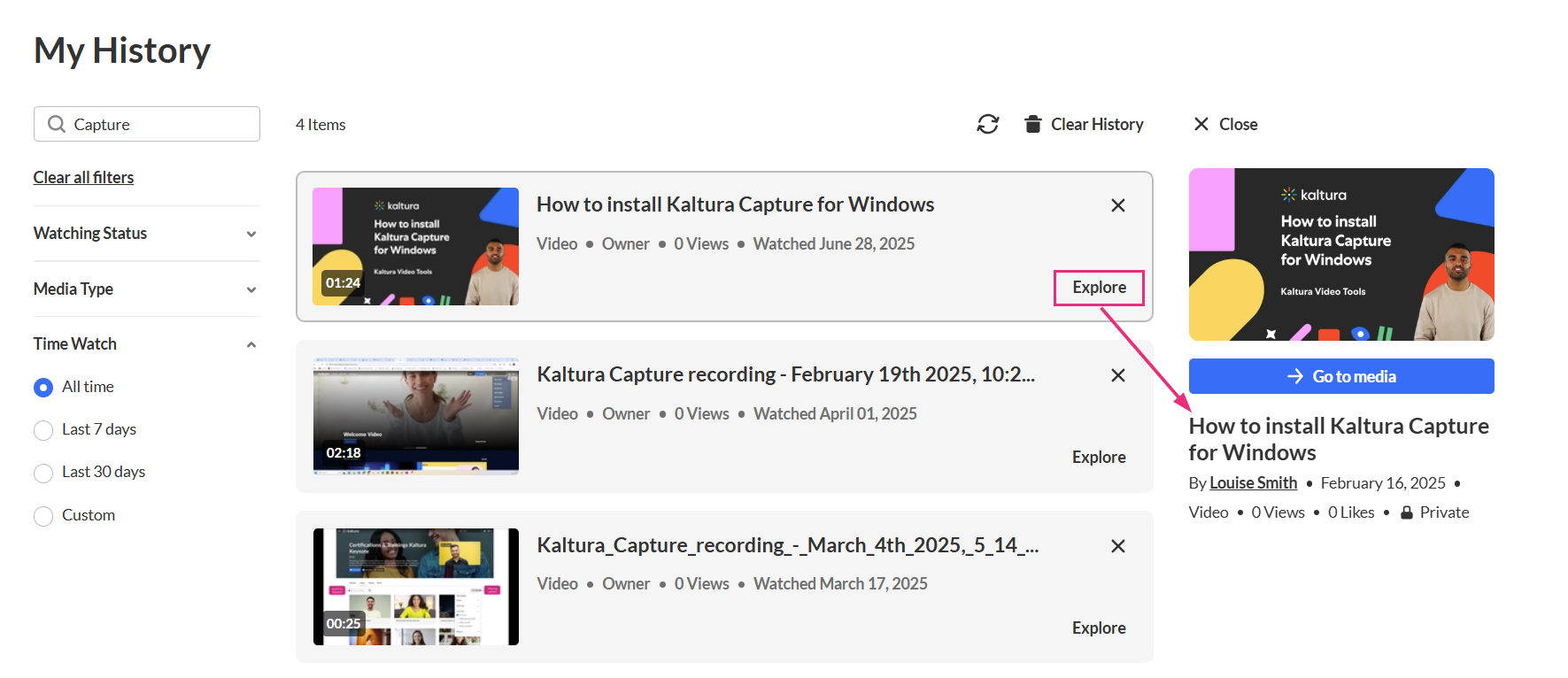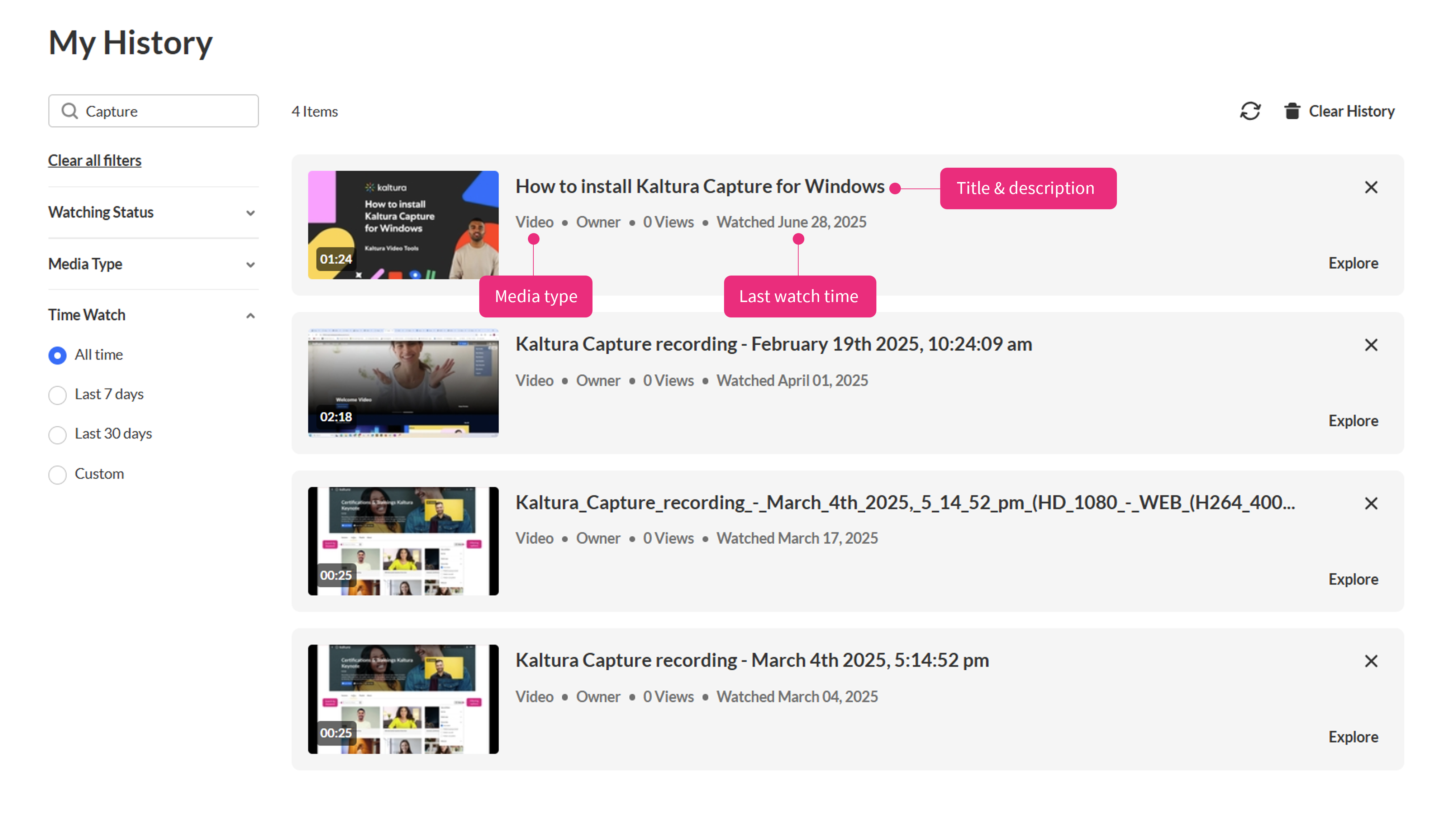 The My History page lets you quickly find media you’ve watched in your video portal. You can search by keyword and use filters to narrow results by media type, viewing status, or time range.