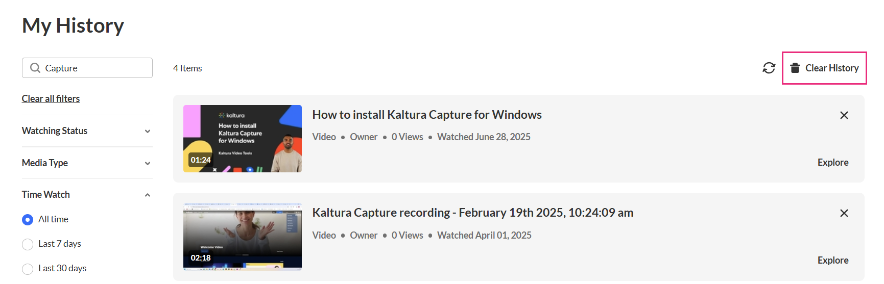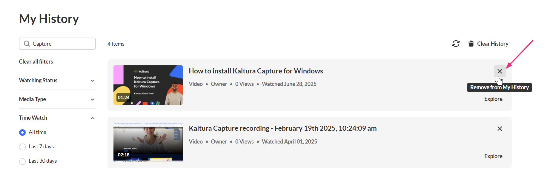To remove a single item from your history, click the X at the top right corner of the media card.