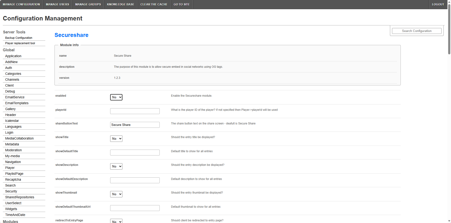 The Secureshare module allows embedding content inline that requires authentication. The sections herein will guide you through logging into the Video Portal's Configuration Management section and enabling and configuring the Secureshare module.