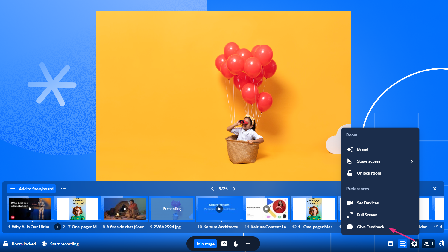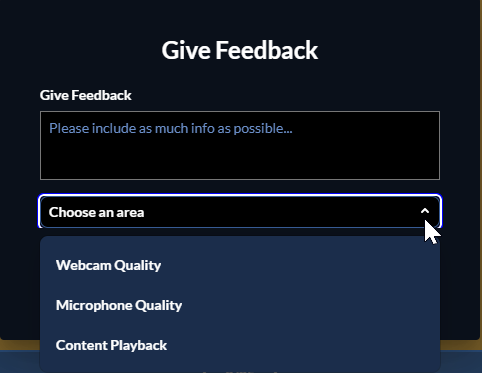 You can send feedback or report technical problems, such as webcam quality, microphone quality, or content playback directly from within a Kaltura Room session.