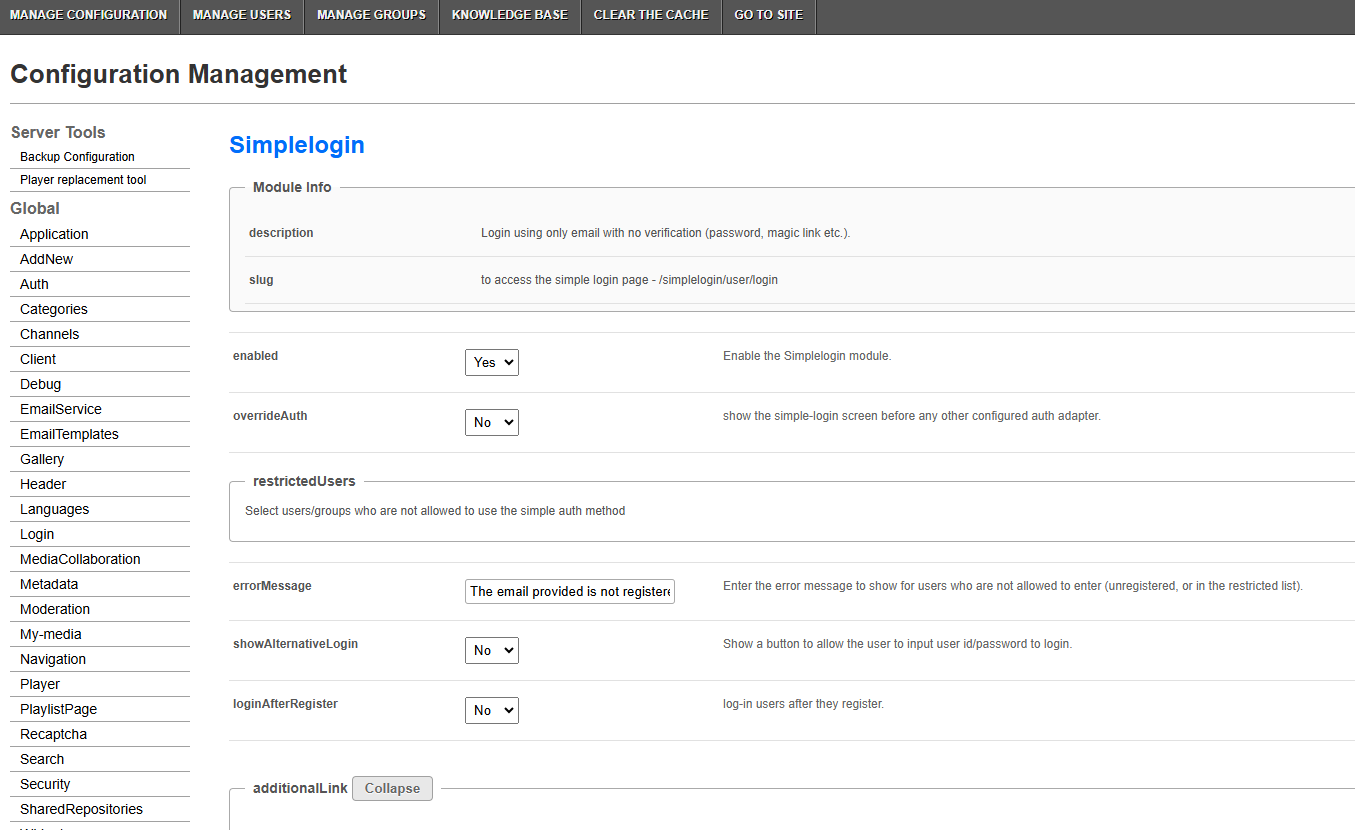 1. Go to your Configuration Management console and click the Simplelogin module. You can also navigate directly using a link: https://{your_KMS_URL}/admin/config/tab/simplelogin.