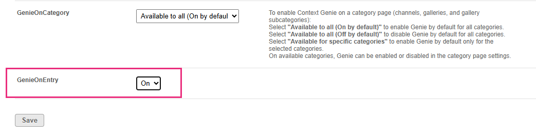 3. Scroll down to the GenieOnEntry field and set to 'On'.