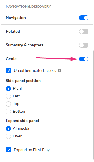 - Unauthenticated access (default = on) - Lets unauthenticated users access Genie for the video they're watching.