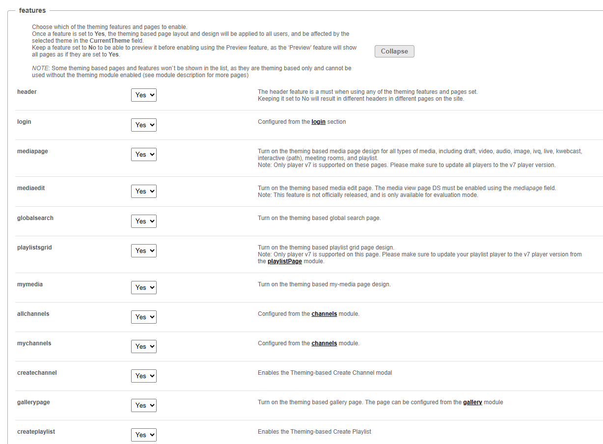 - Set a feature to 'Yes' to apply your selected theme to that page for all users.