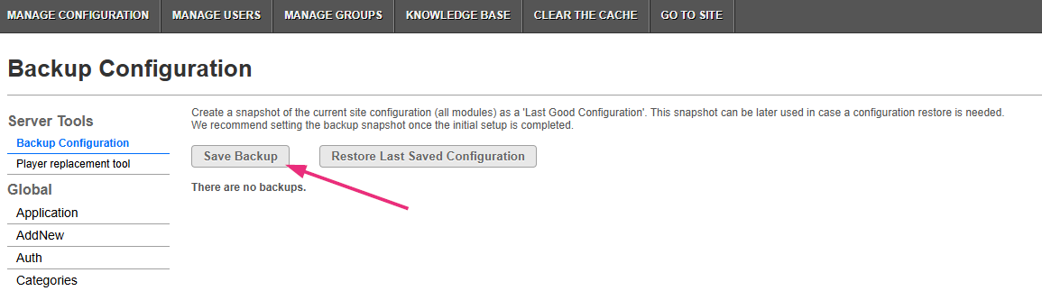 - In the Configuration Backup popup, click Yes, Save. A confirmation message displays: Configuration file was saved successfully.