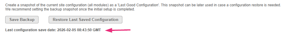 - In the Configuration Backup popup, click OK. A message displays on the Backup Configuration page listing the last configuration save date.
