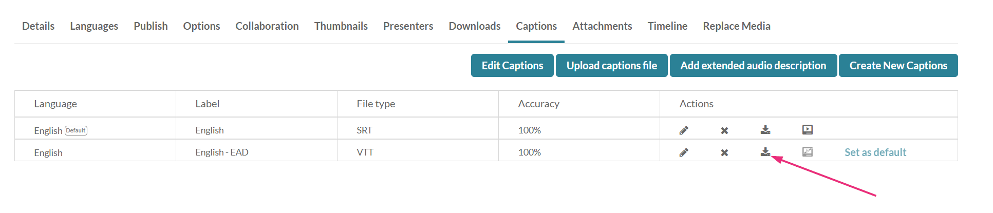In the captions table, locate the EAD file and click the download icon in the same row.