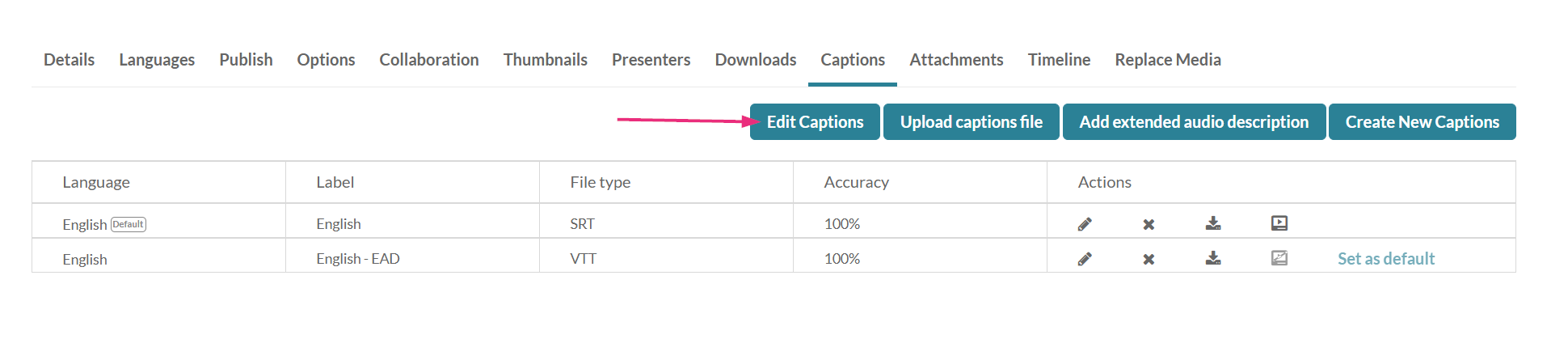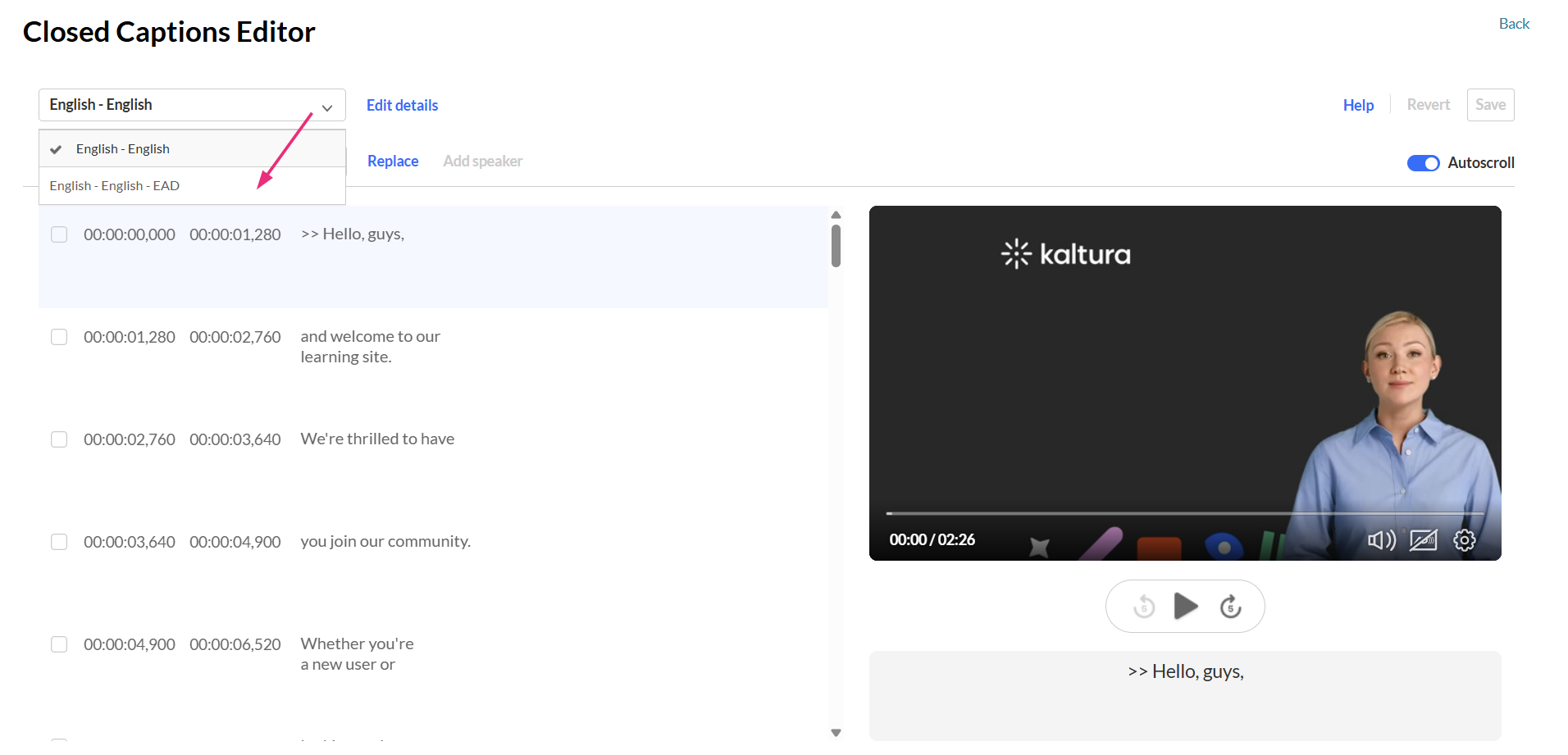 EAD files are uploaded in VTT format and edited using the same interface as captions. Editing an EAD file doesn’t change its type or playback behavior.