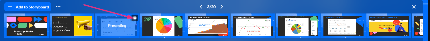 If the active slide contains notes, a notes icon appears on its thumbnail in the storyboard when you hover over it.
